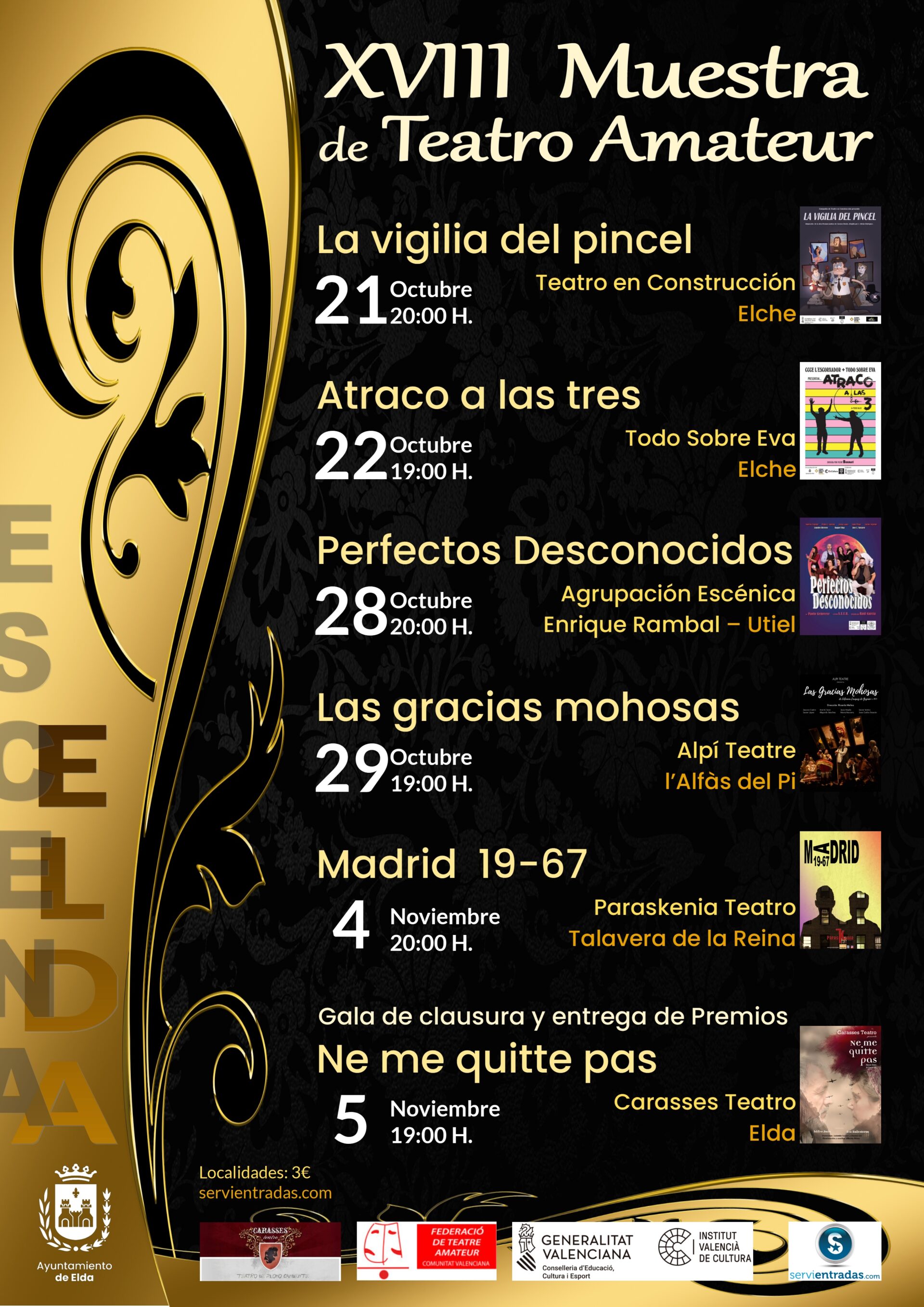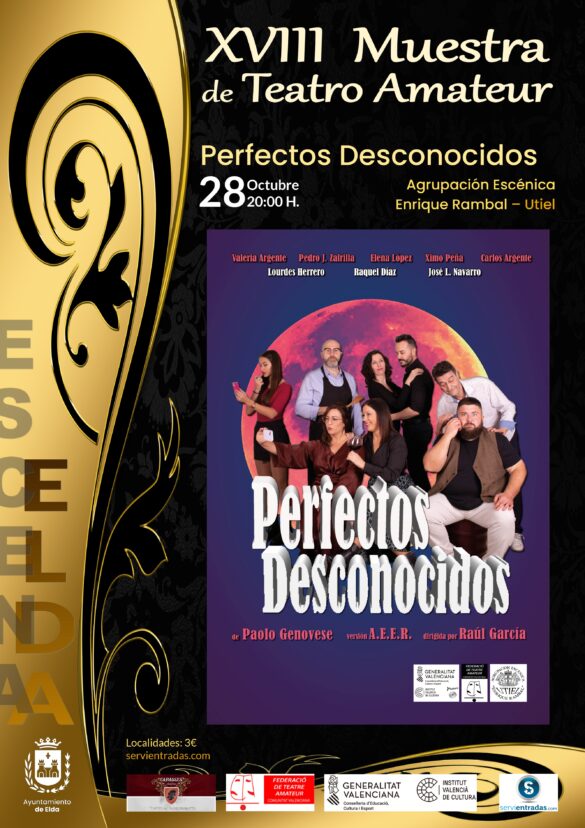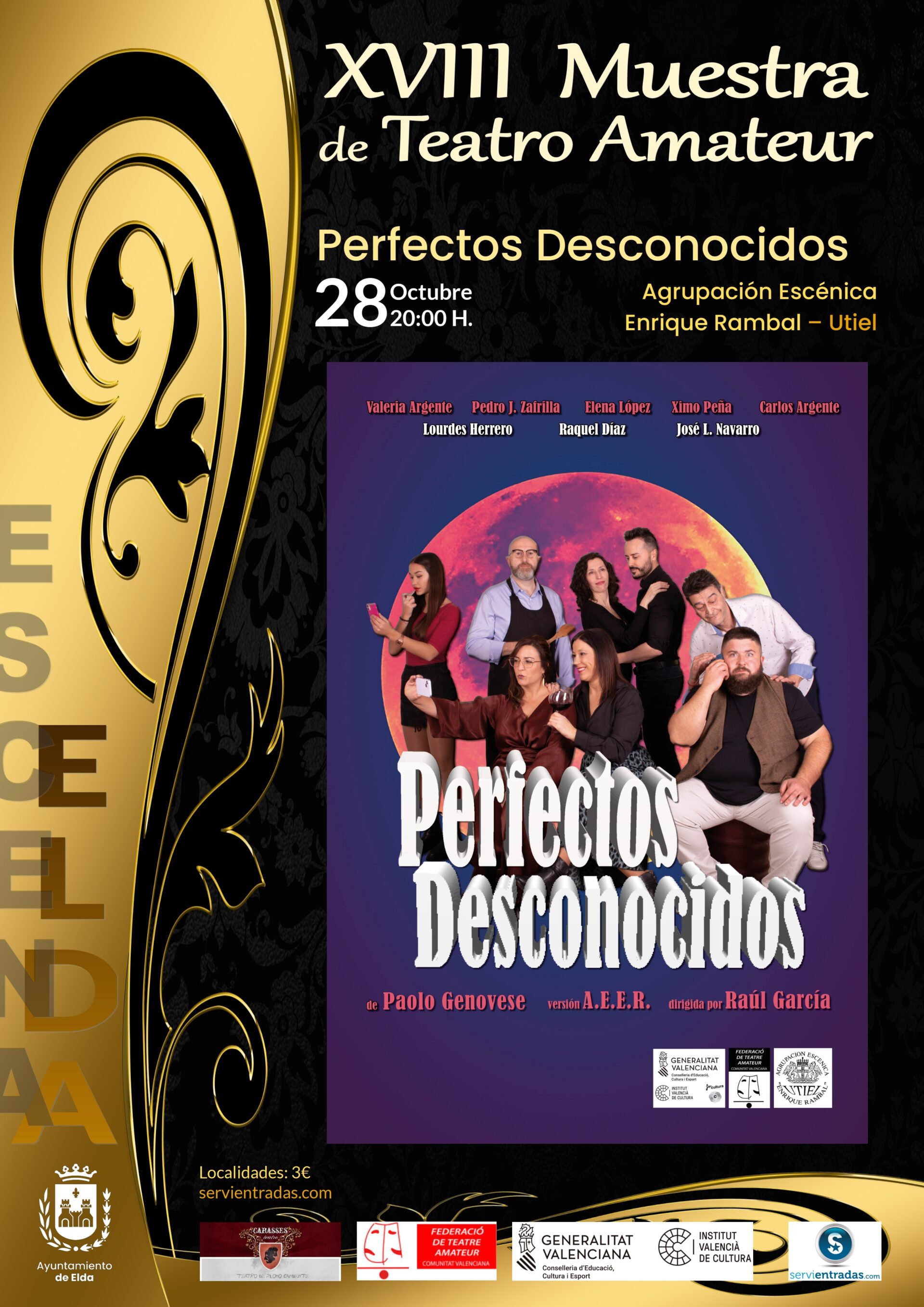 • 28 de octubre, ‘Perfectos desconocidos‘, de la Agrupación Escénica Enrique Rambal (Utiel). Una cena casual entre amigos acaba convirtiéndose en una exposición de todos los males que azotan a nuestra sociedad: homofobia, xenofobia, infidelidades o dependencia a la tecnología.