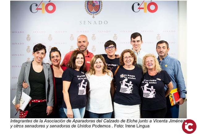 Llevamos más de 40 años trabajando sin ningún derecho y con salarios de miseria, manifestaba Isabel Matute, representante de la Asociación de Aparadoras del Calzado de Elche, antes de la votación en la que el pleno del Senado, sin ningún voto en contra, aprobó la iniciativa de Unidos Podemos por la que se insta al Gobierno a acabar con la discriminación histórica que sufre este colectivo con fuerte implantación en la Comunitat Valenciana. Según un estudio realizado por la Universidad de Alicante, el 88% de las labores de aparado del calzado en la Comunitat Valenciana se realizan al margen del sistema legal, ocasionando una absoluta pérdida de derechos a las aproximadamente 8.000 mujeres que trabajan en este sector, siendo un pilar económico de toda la Comunitat Valenciana, especialmente en localidades como Elche o Elda.