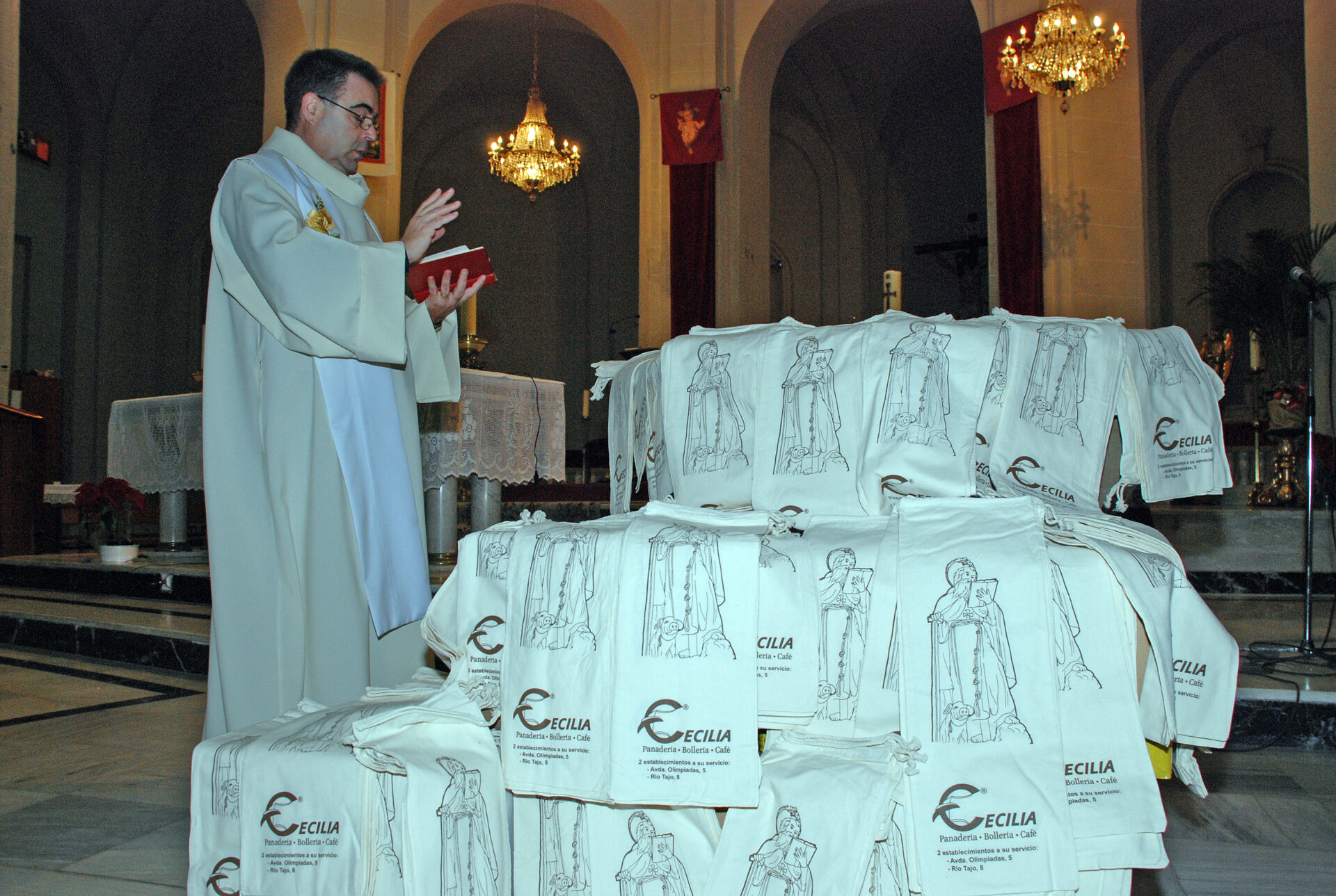 El Consiliario de la Junta Central de Comparsas de Moros y Cristianos, José Abellán, bendice las bolsas que regala una firma comercial con la imagen del santo. Panadería Cecilia regalará también un panecillo para bendecir los días 16 y 17
