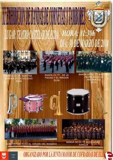 A las 11:00h pasacalles desde la puerta del Excmo. Ayuntamiento hasta el Teatro Castelar, de Elda, en donde aproximadamente a las 11:30h. dio comienzo la XI Exhibición de bandas cornetas y tambores con las bandas de Ntro. Padre Jesús de Medinaceli, Ntra. Sra. de la Soledad y Ntra. Sra. de la Piedad y Perdón de Elda, y las invitadas este año, Agrupación Musical Virgen del Rosario de Crevillente y Banda de cornetas y tambores del Ecce-homo de Jumilla.