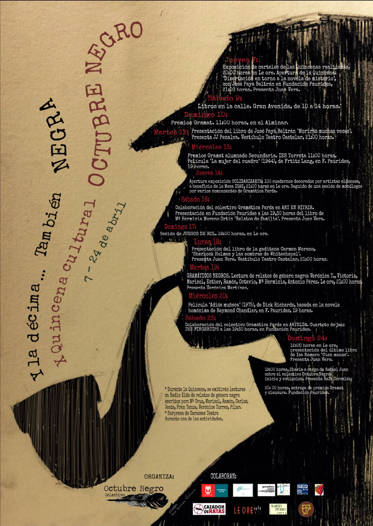 Domingo 24: 12:00 horas en Le ore, presentación del último libro de Isa Romero Cien manos. Y El trebol de cuatro hojas, de la Asociación FEDER. Presenta Juan Vera. 19:00 horas, Charla a cargo de Rafael Juan sobre el colectivo Octubre Negro: inicio y evolución. Presenta Rafa Carcelén; 20: 00 horas, entrega de premios Gramat y clausura. Fundación Paurides.