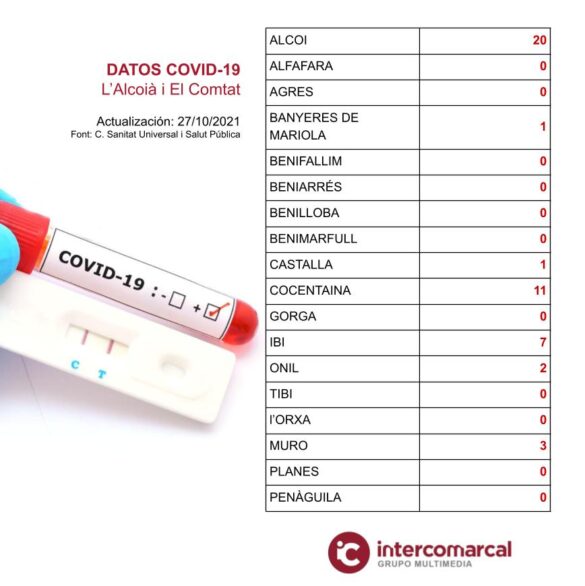 Les ofrecemos la última actualización de datos COVID-19 en los municipios de las comarcas del Alto y Medio Vinalopó, L’Alacantí, L’Alcoià y El Comtat. PCR’s positivas de los últimos 14 días con fecha del 26 de octubre de 2021.