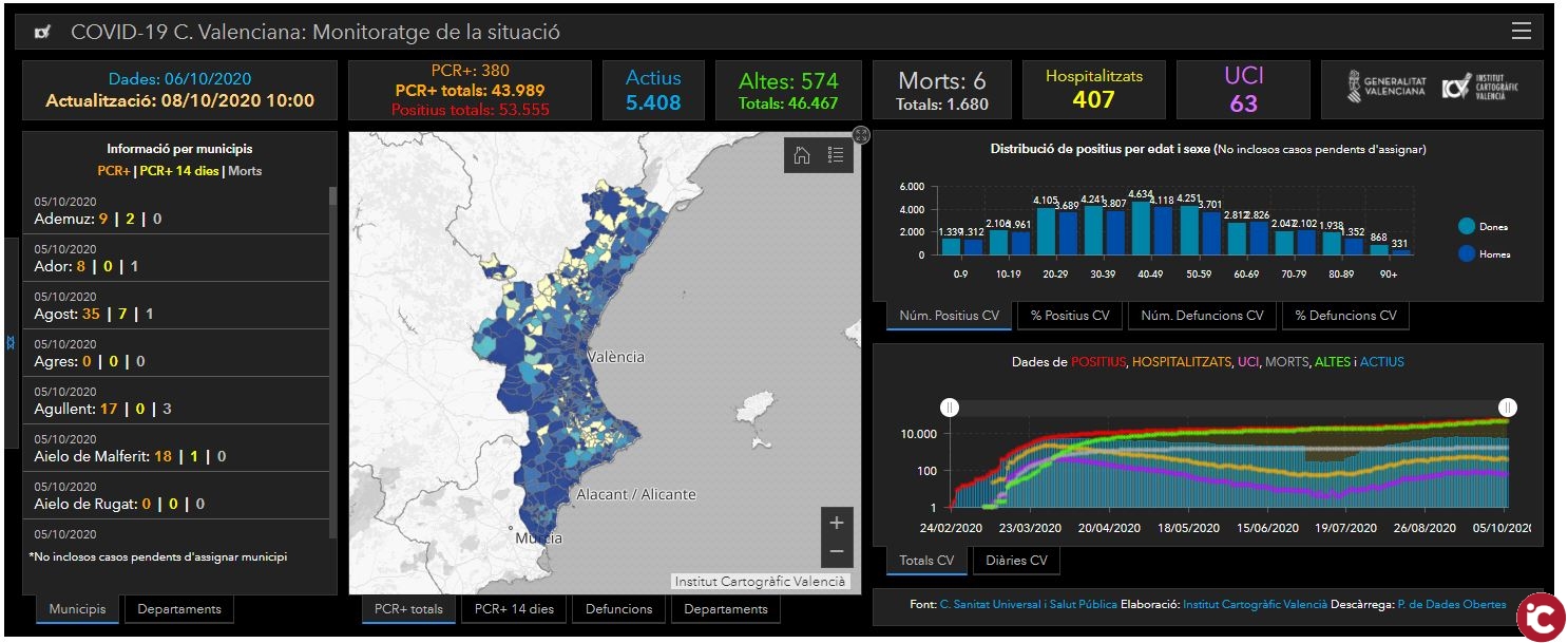 A día de hoy, hay algún caso positivo en 32 residencias de mayores (3 en la provincia de Castellón, 9 en la provincia de Alicante y 20 en la provincia de Valencia), 3 centros de personas con diversidad funcional (0 en la provincia de Castellón, 2 en la de Alicante y 1 en la de Valencia) y 2 centros de menores (1 en la provincia de Alicante y 1 en la provincia de Valencia).