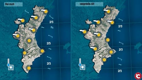 De loratge de hui només cal destacar el descens de les temperatures que notarem especialment junt a la costa on lentrada de vents dorigen marítim portaran aire més fresquet i humit. Al nord el mestral es deixarà sentir amb ratxes moderades fins a migdia.