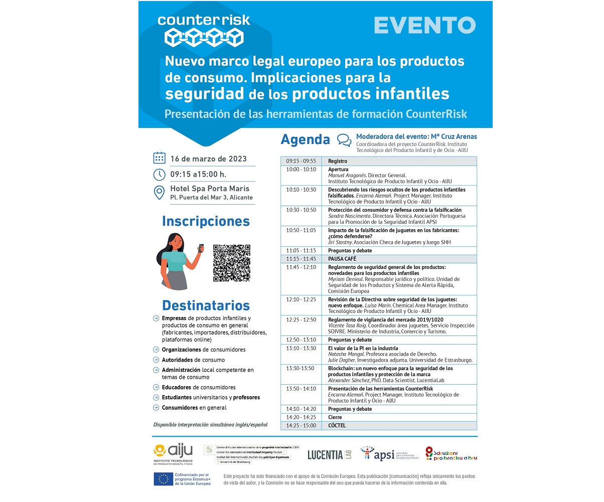 El proyecto europeo CounterRisk (www.counterrisk.eu), financiado por el programa Erasmus+ de la Comisión Europea, tiene como objetivo formar y concienciar sobre los riesgos de los productos infantiles falsificados, mejorando, así, las habilidades, tanto de las empresas como de los consumidores, a la hora de protegerse de los riesgos de estas falsificaciones..