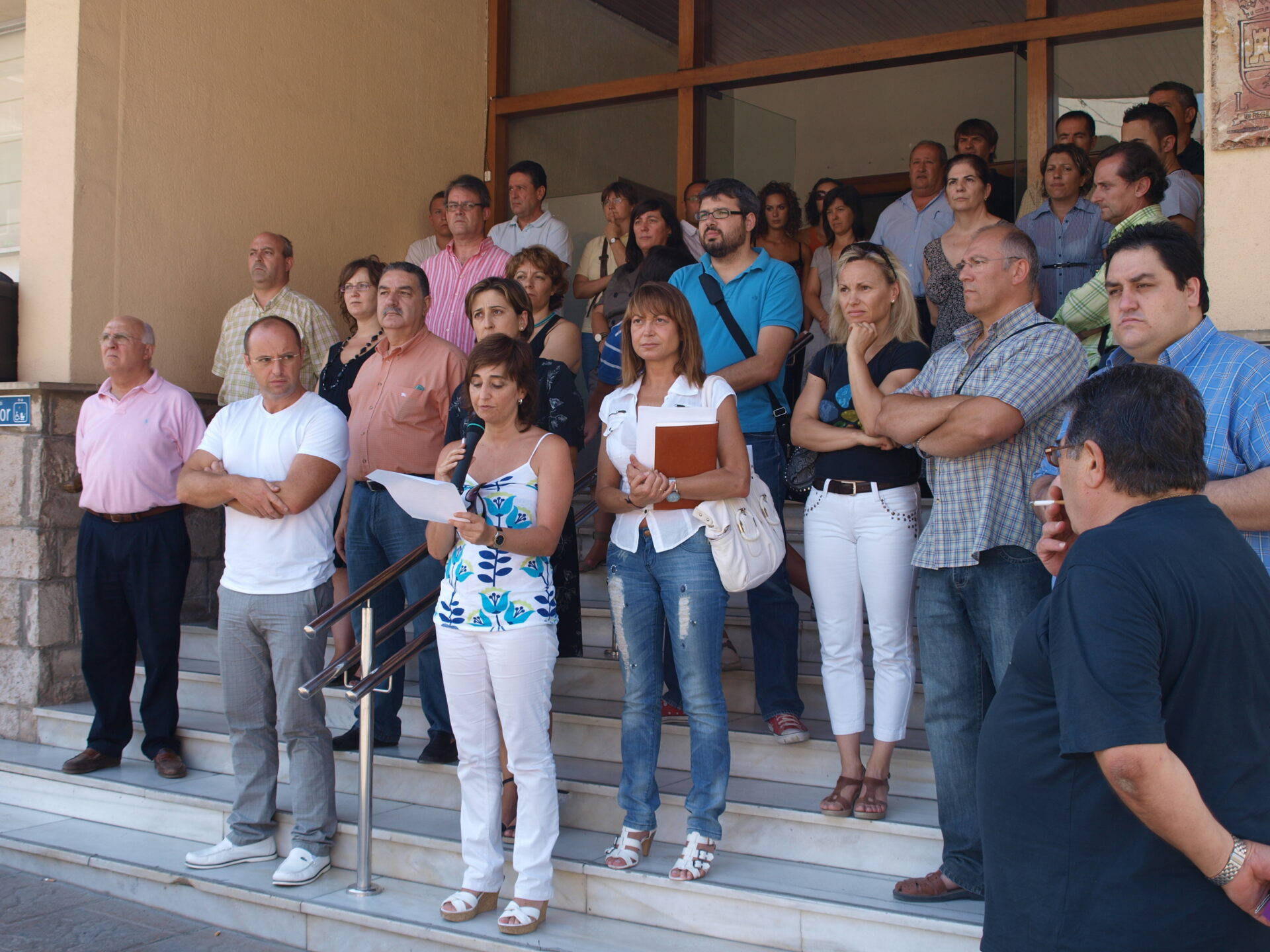 Fotografía de la Concentración de los miembros de la Corporación Municipal y trabajadores del Ayuntamiento de Ibi en repulsa por el atentado perpetrado por la banda terrorista ETA ayer en Palmanova y que mató a dos jóvenes guardiaciviles.
