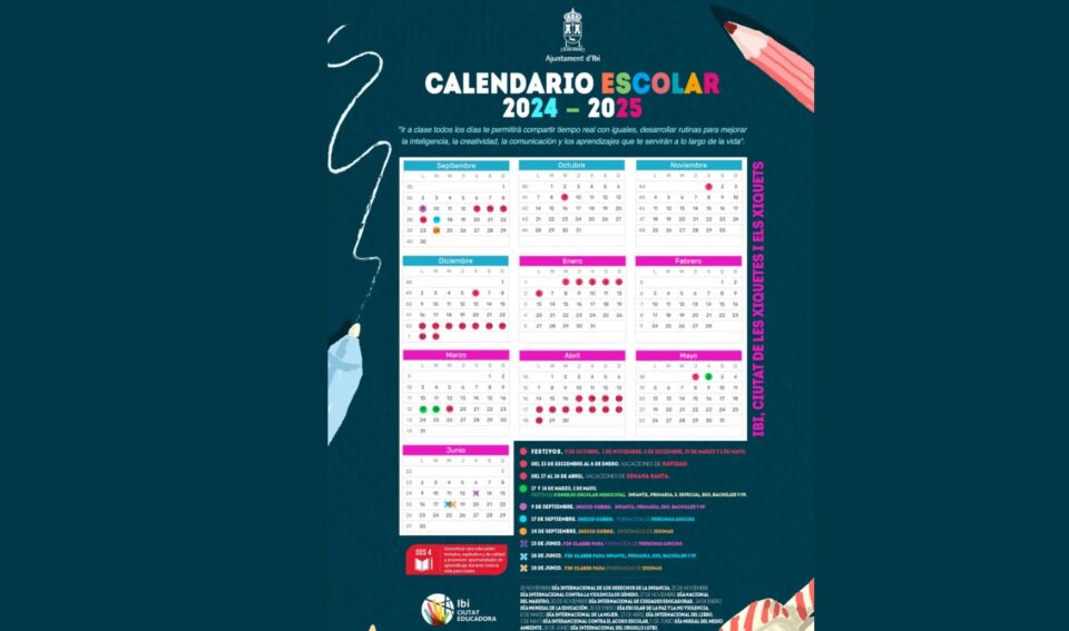 En este calendari escolar d’Ibi trobaràs els festius, tant locals com autonòmics i nacionals, així com les dates d’inici de les diferents modalitats educatives.