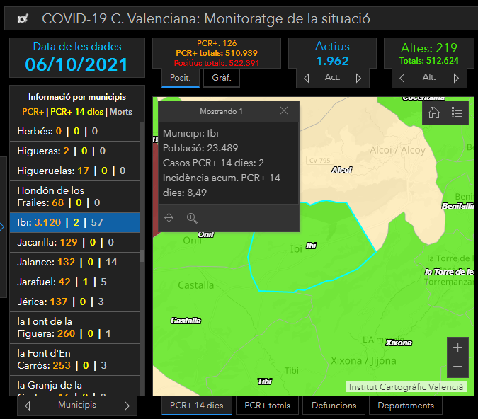 En la última actualización de datos relacionados con los contagios de coronavirus publicada por la Generalitat Valenciana, el pasado 6 de octubre, la localidad de Ibi cuenta con 2 positivos diagnosticados en los últimos 14 días.