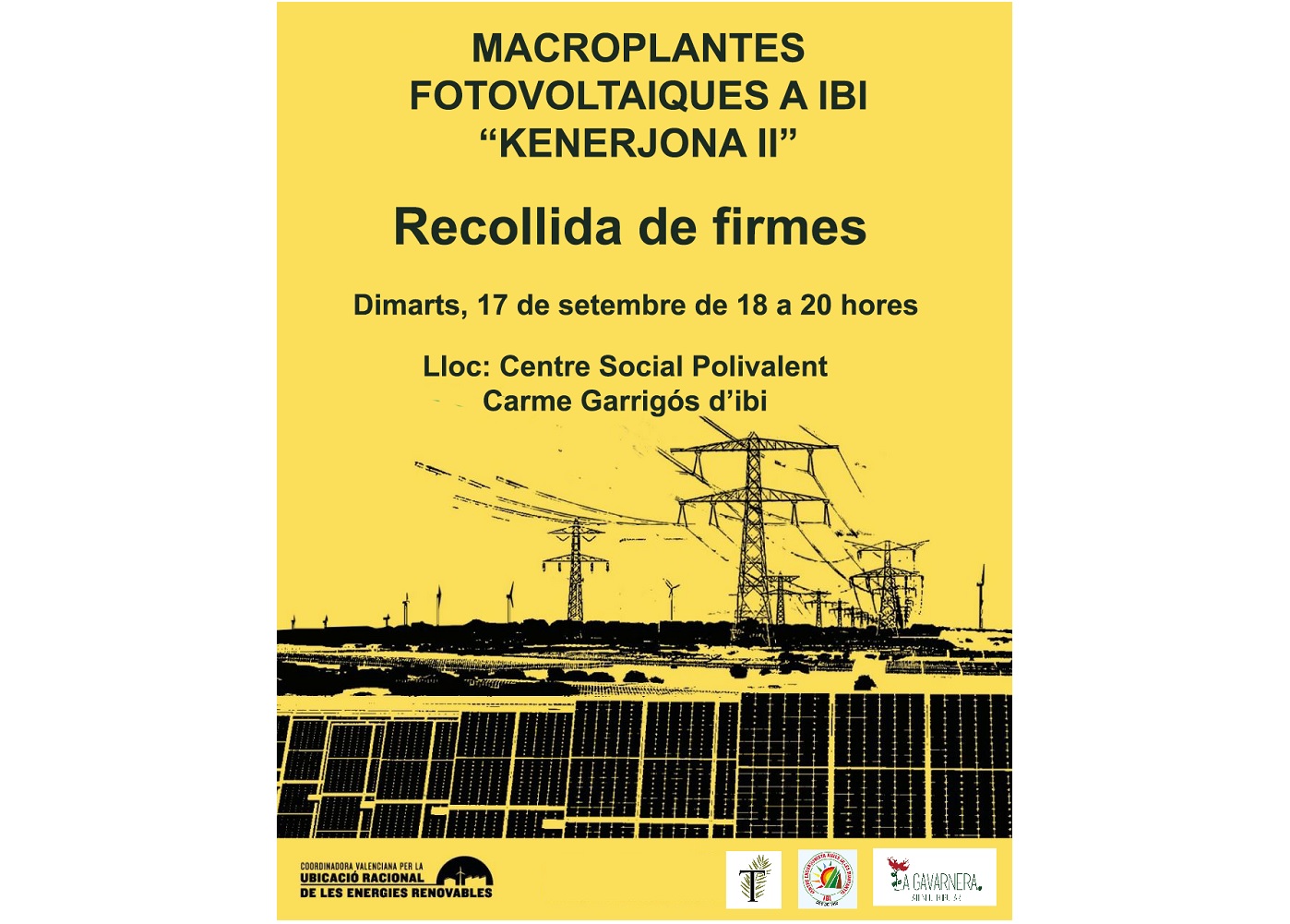 La nostra posició respecte del projecte “KENERJONA II” es resumix en la frase “renovables sí però no així”. Tant l’empresa promotora com les administracions, s’han oblidat de l’opció més sostenible, social i ecològica: l’autoconsum fotovoltaic, els projectes municipals, les comunitats energètiques locals i les cooperatives. Les plantes fotovoltaiques haurien d’estar supeditades a l’interés general i a la preservació dels recursos naturals, però estem veient que la intenció de projectes com el “KENERJONA II” a Ibi i el “KENERJONA I” de Castalla, amb la infraestructura d’evacuació de Tibi, són merament especulatives.