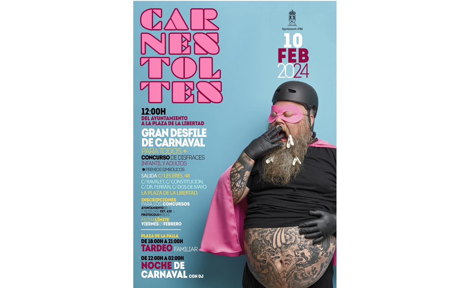 Las personas interesadas en participar en los concursos deben de inscribirse en el despacho de la concejalía de Fiestas, en la segunda planta del Ayuntamiento de Ibi,a través del mail protocolo@ibi.es o en el 965552450 (ext. 620), cuya fecha límite será el viernes, 9 de febrero, a las 12:00 h. La información y las bases del concurso están disponibles en www.ibi.es. Para simplemente desfilar, sin participar en los concursos, no hace falta estar inscrito en el desfile.