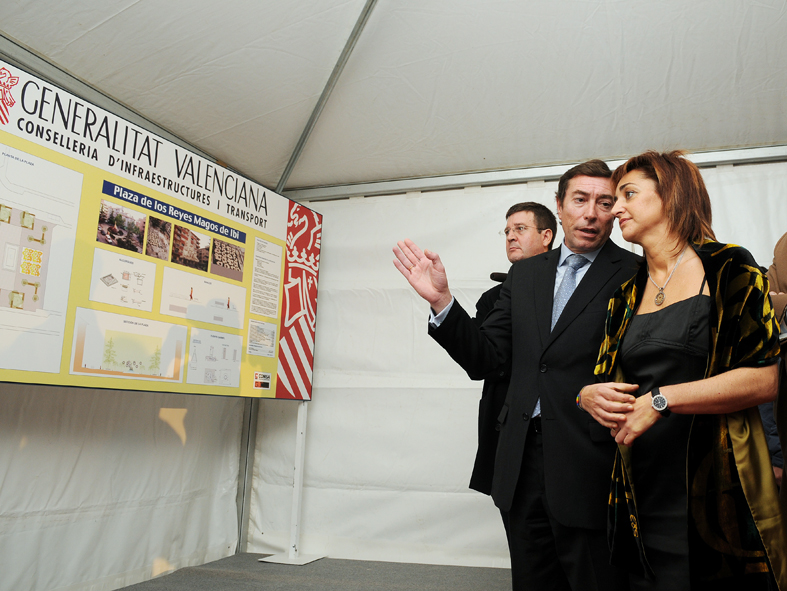 La alcaldesa de Ibi, Mayte Parra, el Conseller de Infraestructuras, D. Mario Flores Lanuza y el Secretario Autonómico de Infraestructuras y Transportes, D. Victoriano Sánchez Barcaiztegui inauguran las Obras de reurbanización de la Plaza de los Reyes Magos el viernes, 4 de enero, el mismo día en que el Heraldo visita Ibi para que los niños puedan entregarle la carta que éste llevará a Sus Majestades.