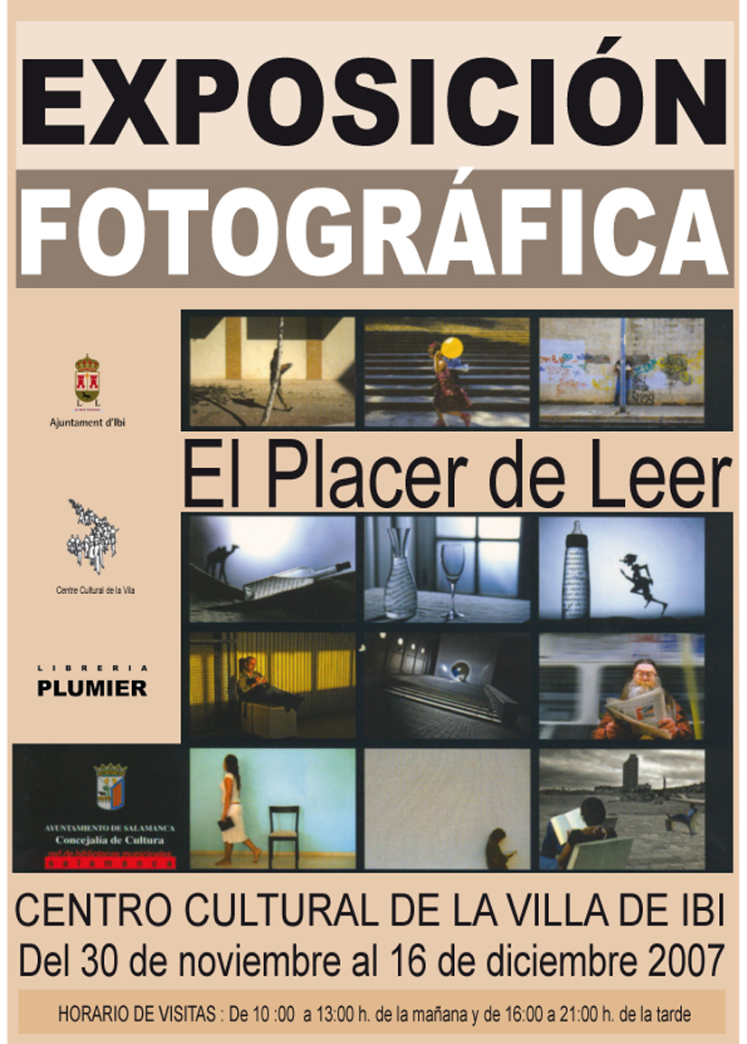 Librería Plumier, en colaboración con la Concejalía de Cultura del Excmo. Ayuntamiento de Ibi, tiene el gusto de invitarle a la inauguración del la exposición fotográfica, EL PLACER DE LEER, que corresponde a la 13ª edición del concurso del mismo nombre que convoca la Biblioteca de Salamanca. En esta serie de fotografias se encuentra expuesta el primer premio a fotografía individual obtenido por el fotógrafo ibense D. Carlos Verdú Belda. El acto tendrá lugar en el Centro Cultural de la Villa el día viernes 30 de noviembre a las 20 horas.