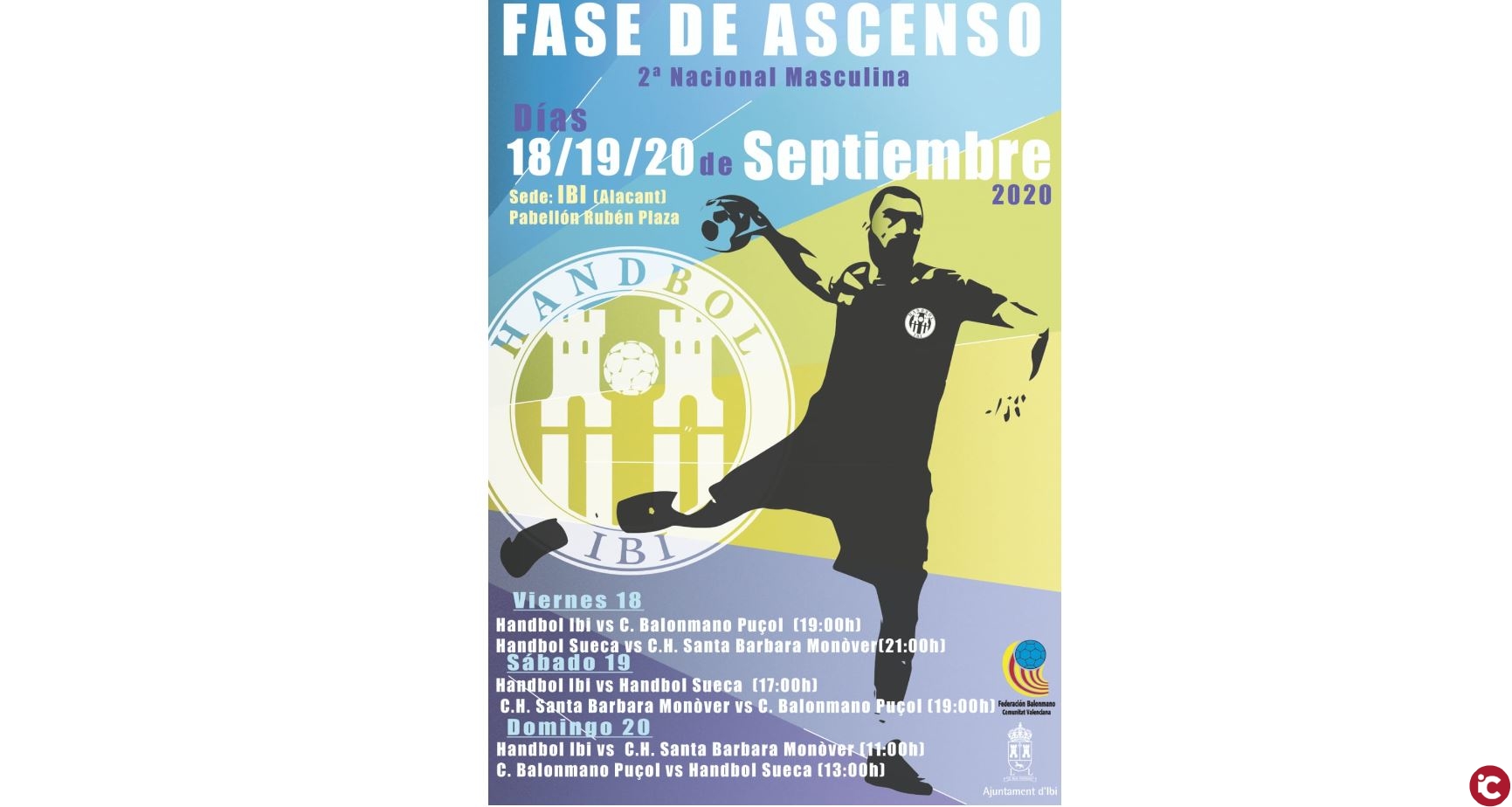 Comienza la cuenta atrás para que el pabellón Rubén Plaza de Ibi acoja la Fase de Ascenso a 2ª Nacional el fin de semana del 18 al 20 de septiembre. Para el Club Handbol Ibi supone todo un reto, ya que hace apenas 4 años que el proyecto está en marcha. Su presidente afirma que están «muy ilusionados» y que ya llevan 1 mes entrenando para llegar lo mejor posible a una Fase en la que tendrán como rivales al CH Santa Bárbara-Monòver, el CBM Puçol y el CH Sueca.