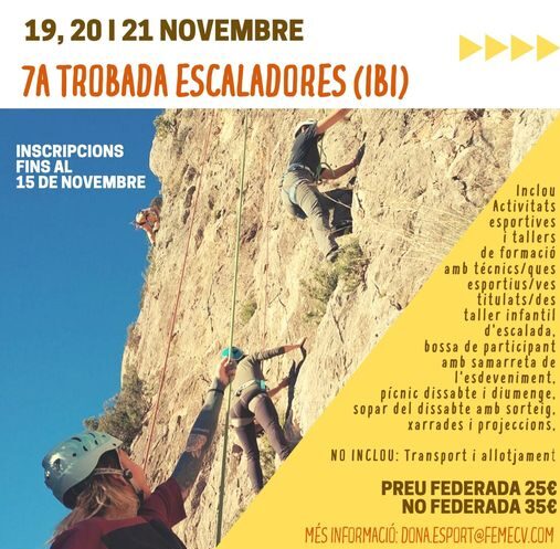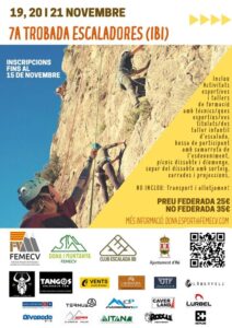 Iniciamos las actividades con el Encuentro de Barrancos y ahora celebramos el 7º Encuentro de Escaladoras, que se celebrará en Ibi, durante los días 19, 20 y 21 de noviembre. El Club Escalada Ibi y el Ayuntamiento de Ibi colabora con la vocalía en la organización.