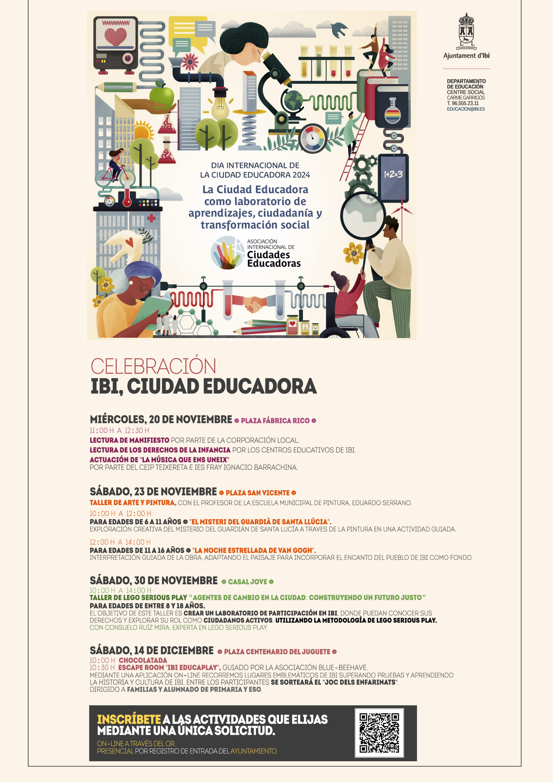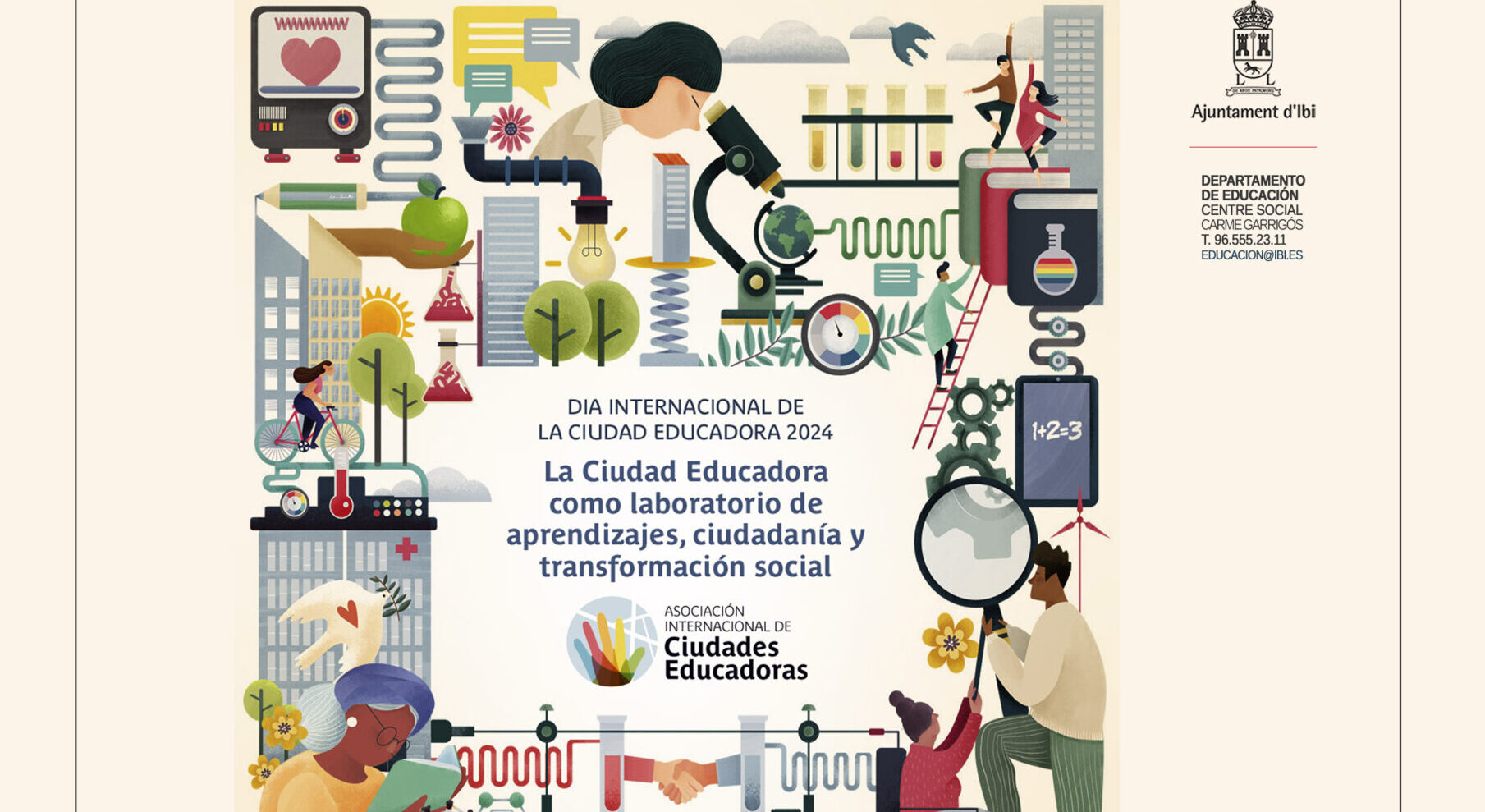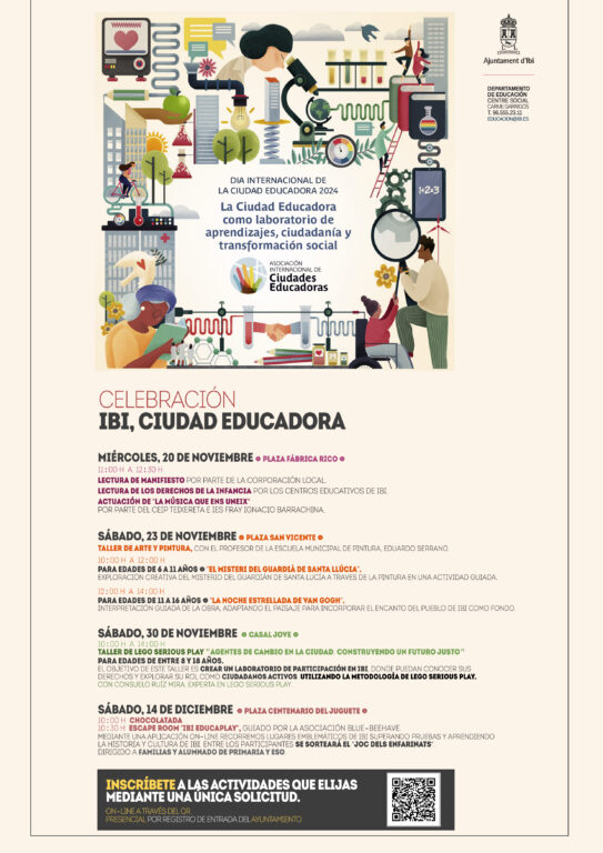 Sota el lema “La Ciutat Educadora com a laboratori d’aprenentatges, ciutadania i transformació social”, la regidoria d’Educació de l’Ajuntament d’Ibi organitza la celebració del Dia Internacional dels Drets de la Infància, el 20 de novembre, i el Dia de la Ciutat Educadora, el 30 de novembre.