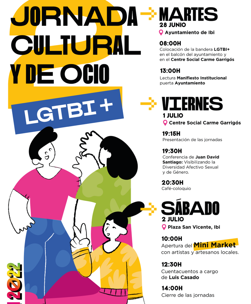 El Ayuntamiento de Ibi, a través del área de Igualdad, organiza un año más la Jornada Cultural y de Ocio LGTBI+ cuyo inicio tendrá lugar el martes, 28 de junio, a las 8:00 h, con la colocación de la bandera LGTBI+ en el balcón del ayuntamiento y en el Centre Social Carme Garrigós. A las 13:00 h, tendrá lugar la lectura del Manifiesto Institucional en la puerta del Ayuntamiento.