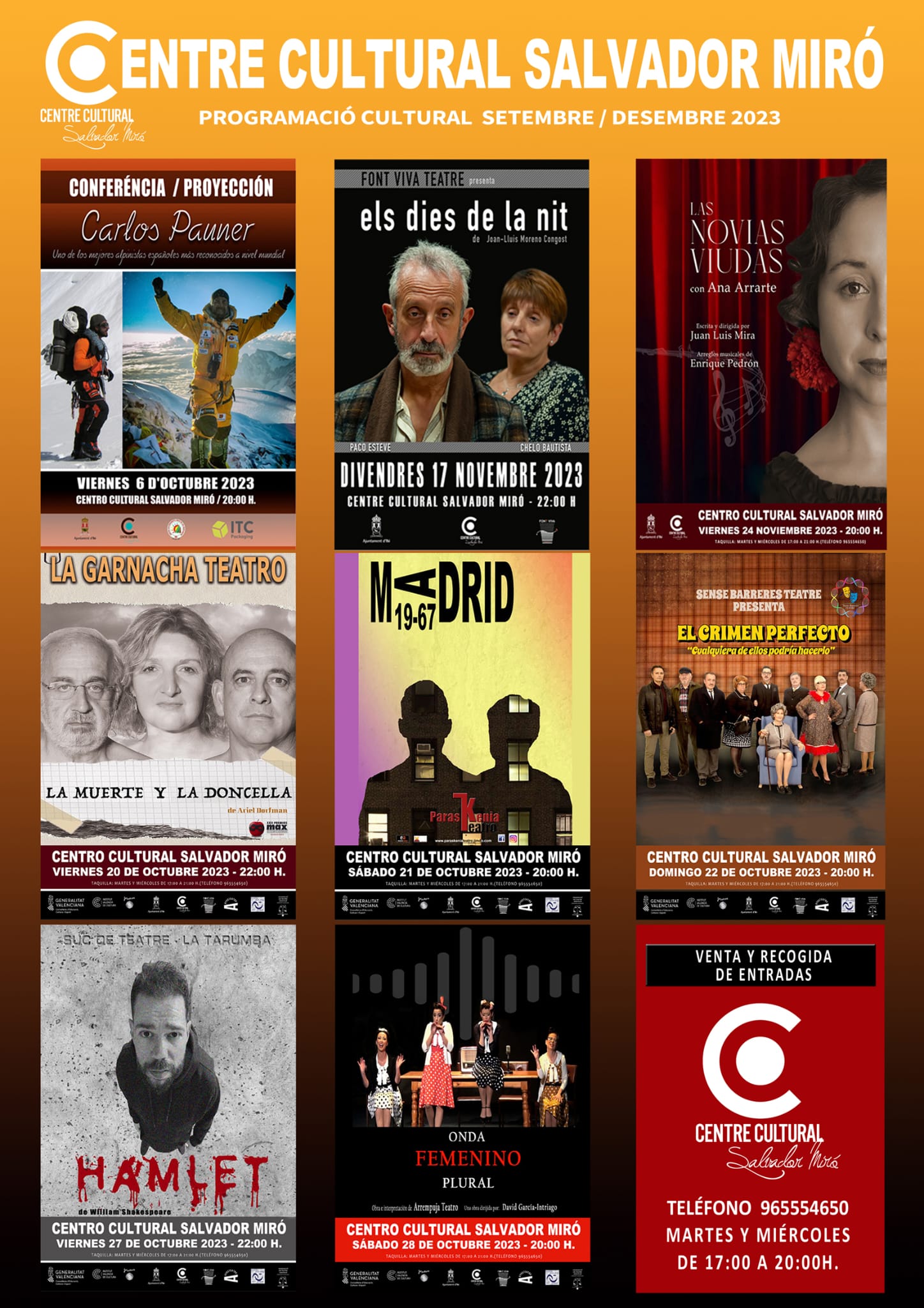 L’àrea de Cultura de l’Ajuntament d’Ibi publica la programació cultural prevista per a l’últim trimestre de l’any, amb una cartellera per a tots els públics, en la qual no falta la música, la comèdia, la tradició, meravelloses posades en escena, ball, teatre, actuacions infantils…que, segur, ompliran d’entreteniment tant el Centre Cultural Salvador Miró com el Teatre Riu de la localitat.