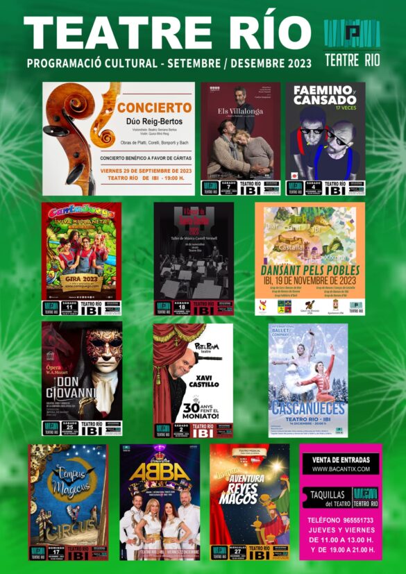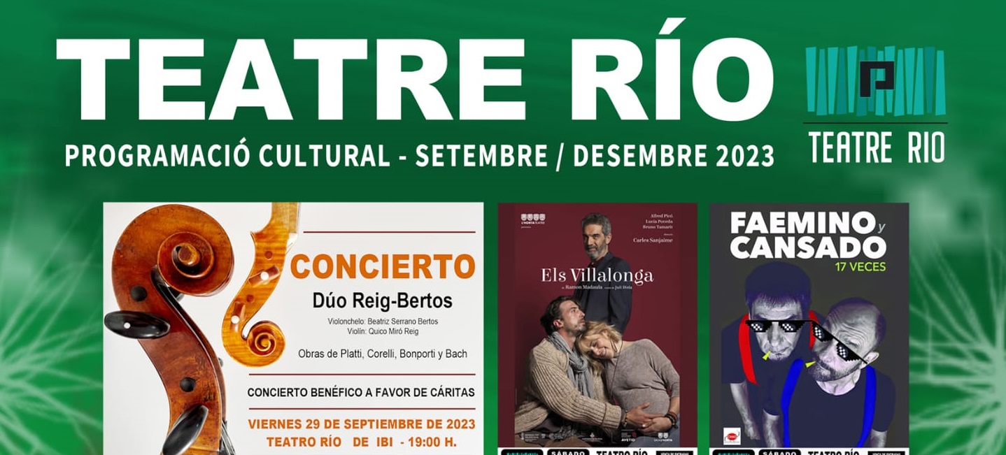 Paral·lelament, la programació del Teatre Río, de setembre a desembre, inclou una variada oferta que comença amb el concert benèfic a favor de Càritas “Duo Reig-Bertos”, amb Beatriz Serrano Bertos al violoncel i Quico Miró Reig al violí, el divendres 29 de setembre, a les 19.00 h, en el Teatre Riu. A l’octubre, l’obra teatral “Els Vilallonga” trepitjarà els escenaris del teatre el dissabte 7, a les 20:00h.