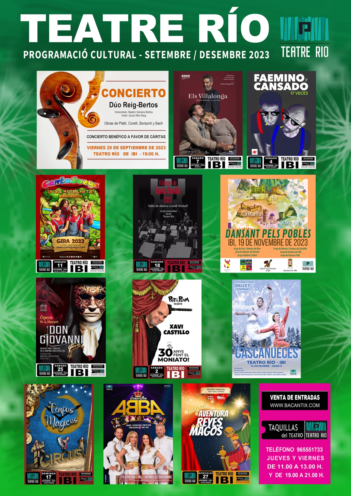 L’humor arriba Al Teatre Riu amb “Faemino i Cansat. 17 vegades”, el dissabte 4 de novembre, a les 20.00 h. I el següent dissabte, 11 d’octubre, el públic infantil el passarà bomba amb la gira 2023 de “Cantajuegos. Viva el meu planeta”, en dos passes, a les 16.30 h i a les 19.00 h. Saltem de nou a la fi de setmana següent, el 18 de novembre, per a gaudir, a les 19.00 h, del V Concert de Santa Cecilia 2023, de la mà del Taller de Música Castell Vermell d’Ibi. Aqueix mateix diumenge, 19 de novembre, se celebrarà el ja tradicional espectacle de música i dansa tradicional “Dansant pels pobles”, amb el Grup de Danses d’Ibi com a amfitrió d’altres grups de ball de Biar, Xixona, Onil, Castalla i Tibi. Per a finalitzar el mes, el dissabte 25 de novembre es podrà gaudir de l’òpera de W.A. Mozart “Don Giovanni”, a les 20.00 h.