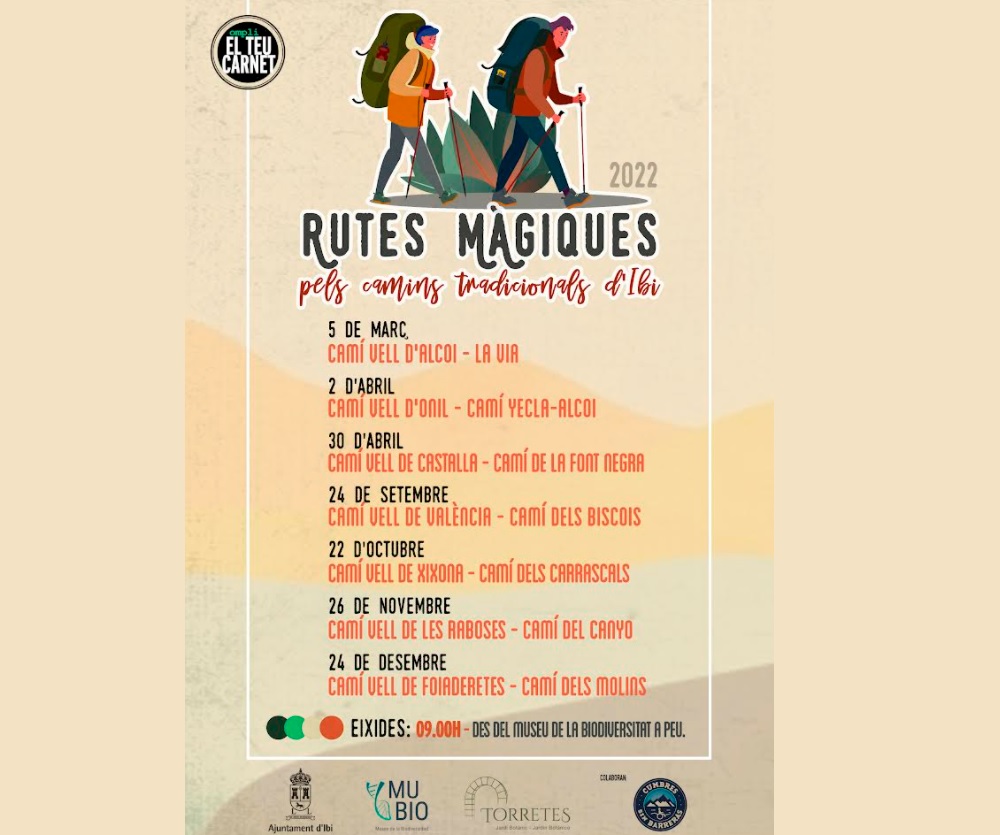 El Ayuntamiento de Ibi, a través de la concejalía de Medio Ambiente y la de Deportes, del Museo de la Bodiversidad y el Jardín Botánico de Torretes de la UA en Ibi, programa una nueva agenda de actividades de “Rutes Màgiques pels camins tradicionals d’Ibi” para este año 2022, tras el parón del pasado año.