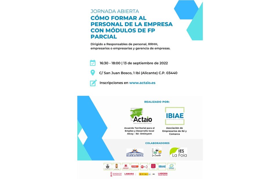 IBIAE (Asociación de empresarios de Ibi y Comarca) y ACTAIO (Acuerdo Territorial para la Ocupación Alcoi-Ibi-Ontinyent) han convocado la Jornada “Cómo formar al personal de la empresa con los módulos de la FP Parcial”, que se celebrará de forma presencial en la sede de IBIAE (C. San Juan Bosco, 1-Ibi) el martes 13 de septiembre a las 16´30 h. con el objetivo de dar a conocer a empresas así como cualquier interesado/a en el tema, información sobre Oferta parcial de la FP. La Oferta Parcial consiste en la posibilidad de matricularse en módulos (asignaturas) sueltos de forma independiente, a diferencia de la matrícula ordinaria que supone inscribirse en todos los módulos que componen el curso. Esta modalidad permite estudiar y compatibilizar con otras actividades. Se trata de una oportunidad para que las personas que trabajan en las empresas de la comarca puedan adquirir o actualizar sus competencias a través de una formación con certificación oficial. También es interesante esta oferta parcial para aquellas personas que quieran aumentar o complementar su formación.