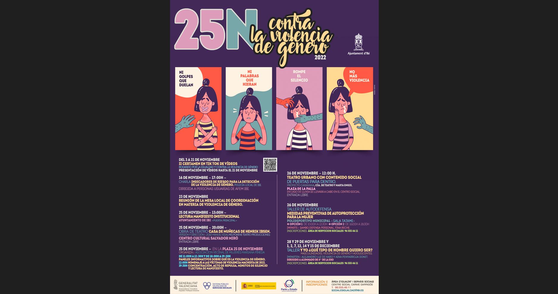 El área de Igualdad del Ayuntamiento de Ibi, en conmemoración por el Día Internacional de la Eliminación de la Violencia contra las Mujeres, organiza un programa de actividades que abarca todo el mes de noviembre. Para comenzar, y desde el 1 de noviembre, está en marcha el II Certamen en Tik Tok de vídeos “Rodando por la Igualdad y contra la violencia de género”, apostando porque los jóvenes principalmente se conciencien al respecto y presentes sus propuestas, cuya fecha máxima es el 21 de noviembre. Las bases están disponibles en www.ibi.es