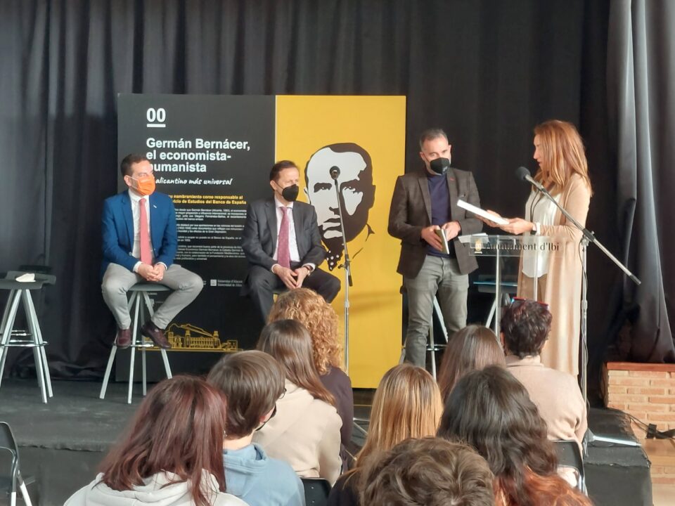 Se procede a la inauguración oficial de la exposición: “Germán Bernácer, el economista-humanista”, de la mano del Aula de Cultura de la Universidad de Alicante en Ibi. A ella han asistido el alcalde de Ibi, Rafael Serralta; la directora de la Cátedra Germán Bernácer, Enar Ruiz; el decano de la facultad de Ciencias Económicas y Empresariales de la UA, Raúl Ruiz y el director del Foro de Debate Económico Germán Bernácer, Pedro Algarra.