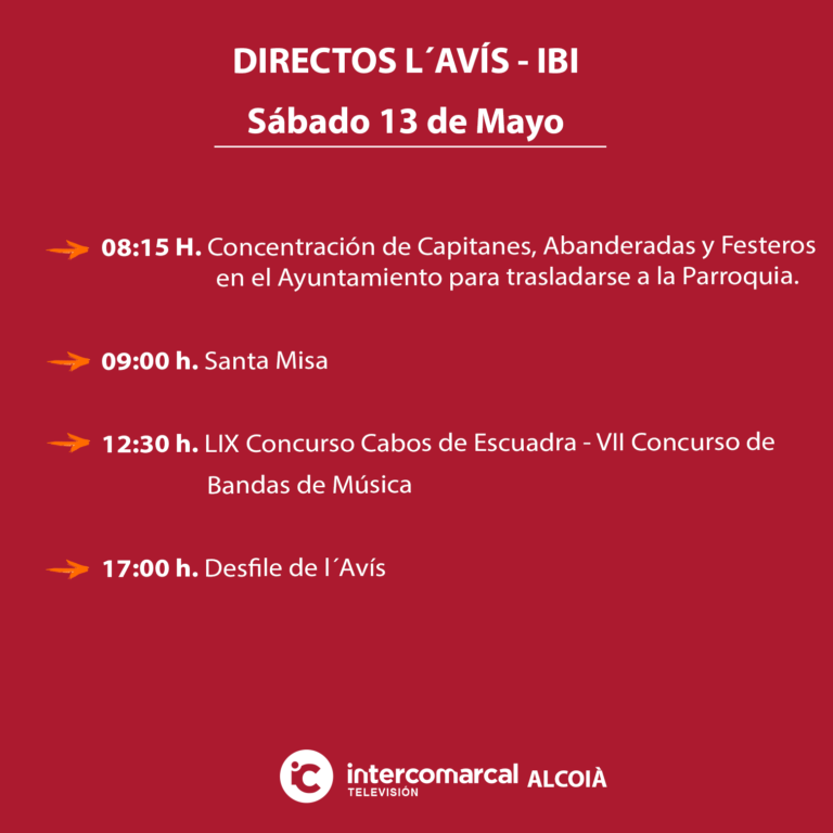 09:00 Horas: EN DIRECTO SANTA MISA. A su finalización, desfile festero hasta la Glorieta de España para el tradicional “ESMORZARET”. El recorrido será el siguiente: calle les Eres, Ravalet, Plaza la Palla, Plaza San Vicente y calle Castalla.