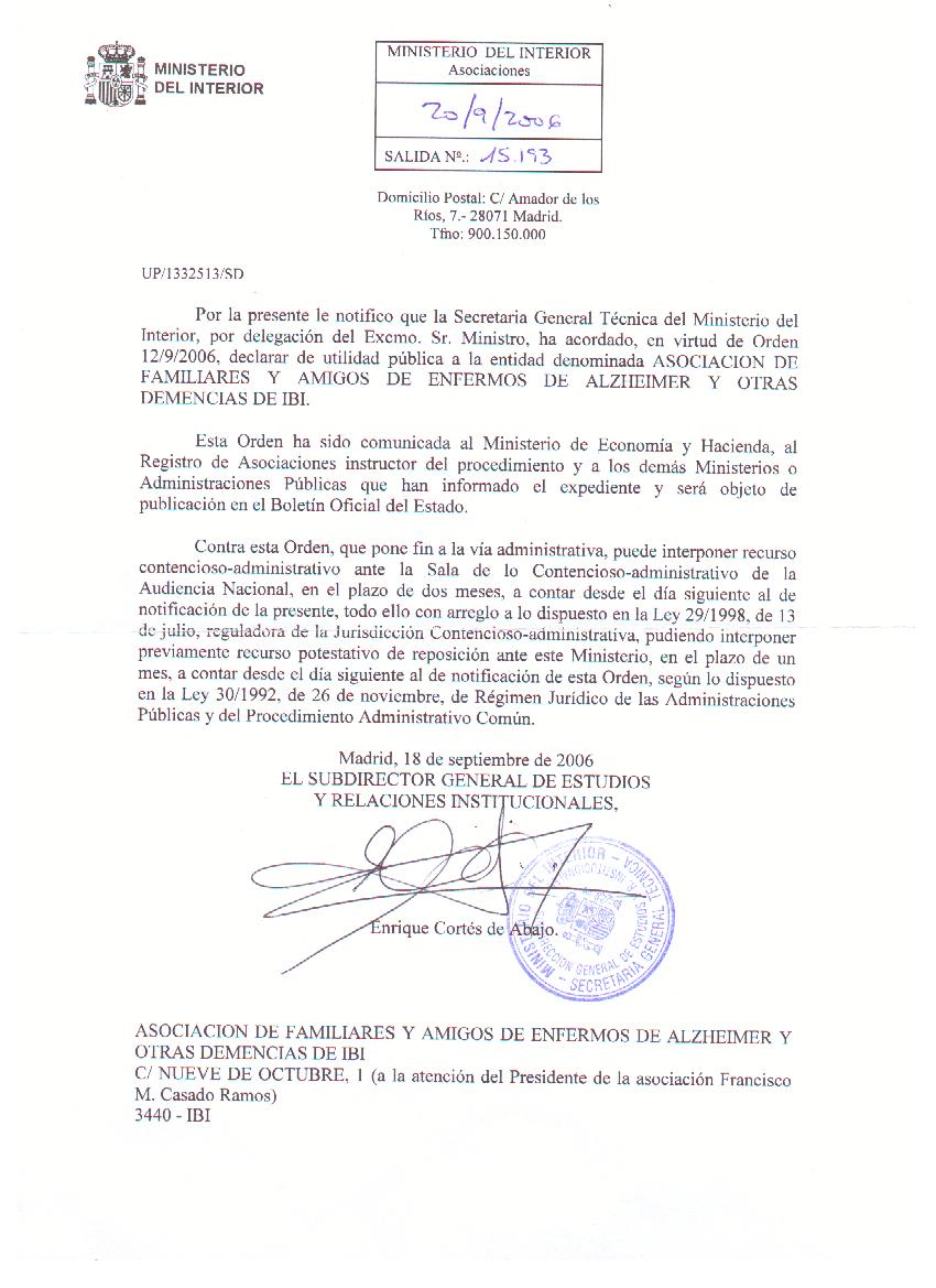 Desde la Asociación de Familiares y Amigos de Enfermos de Alzheimer y otras Demencias de Ibi, tenemos el placer de comunicarles una reciente noticia que nos ha llenado de alegría. El pasado día 18 de Septiembre de 2.006, el Ministerio del Interior tuvo a bien aprobar la solicitud que nuestra entidad había realizada y hemos sido declarados Entidad de Utilidad Pública.