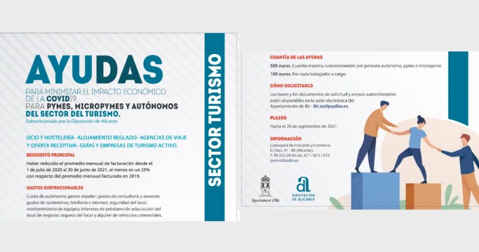 Por otra parte, la Diputación ha publicado una nueva convocatoria de ayudas, las TEN21, destinadas a las Pymes, Micropymes, pequeños empresarios autónomos y profesionales de Ibi del sector Turismo, en el que se incluyen ocio, hostelería, alojamientos reglados, agencias de viaje y oferta receptiva así como guías y empresas de turismo activo.