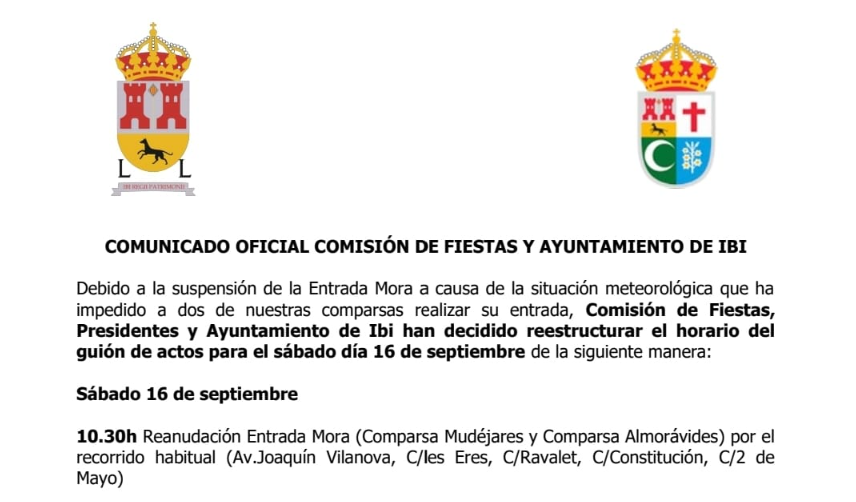 Debido a la suspensión de la Entrada Mora a causa de la situación meteorológica que ha impedido a dos de nuestras comparsas realizar su entrada, Comisión de Fiestas, Presidentes y Ayuntamiento de Ibi han decidido reestructurar el horario del guión de actos para el sábado día 16 de septiembre de la siguiente manera: