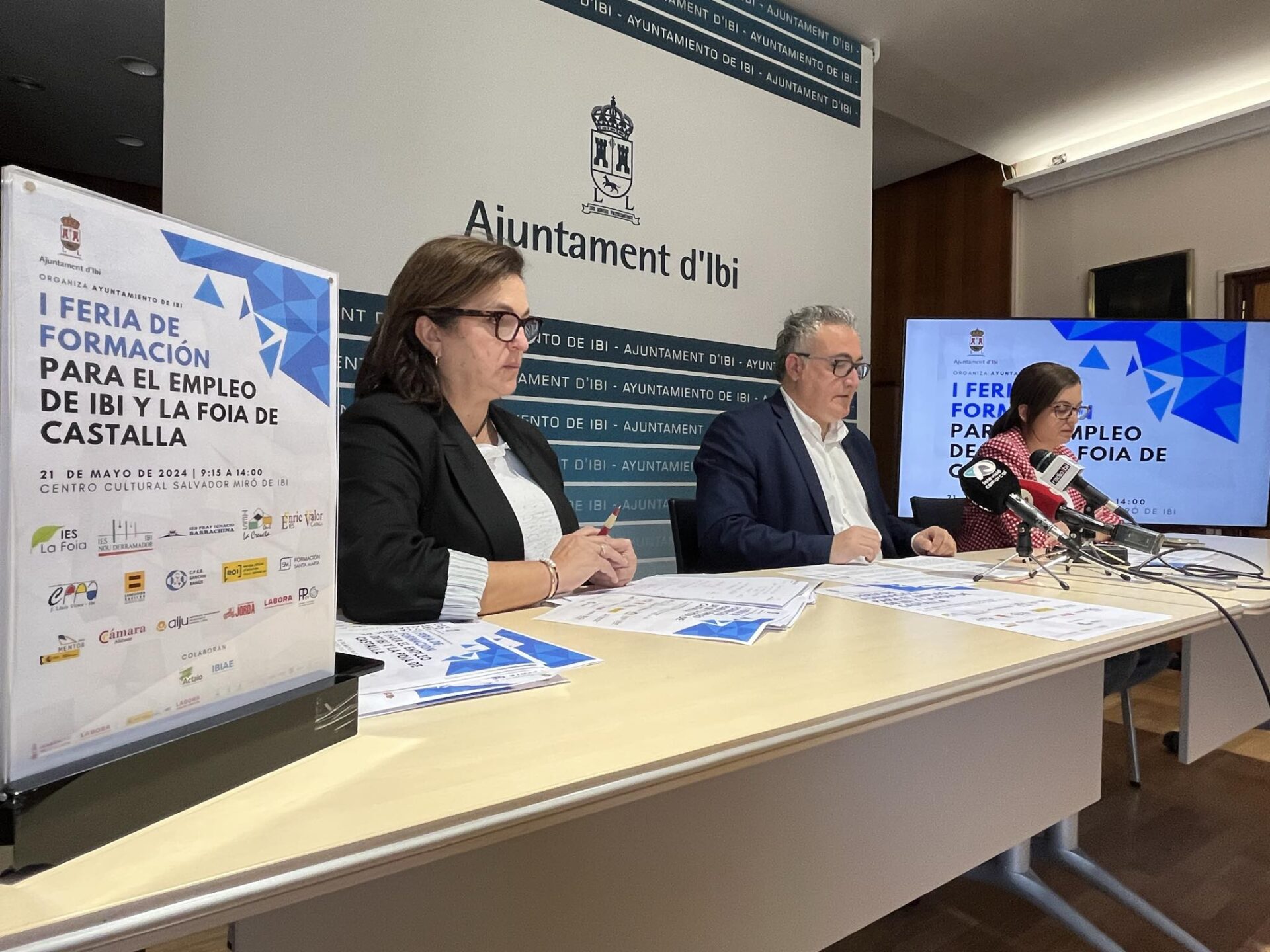 L’alcalde d’Ibi, Sergio Carrasco, delegat de l’àrea d’Indústria i Ús de l’Ajuntament d’Ibi, acompanyat per la vicealcaldessa, Aitana Gandia, i la coordinadora d’Indústria i Ocupació municipal, presentaven aquest matí la I Fira de Formació per a l’ocupació d’Ibi i la Foia de Castalla. La jornada es desenvoluparà el pròxim 21 de maig en el Centre Cultural Salvador Miró d’Ibi, des de les 9.15 h fins a les 14.00 h.