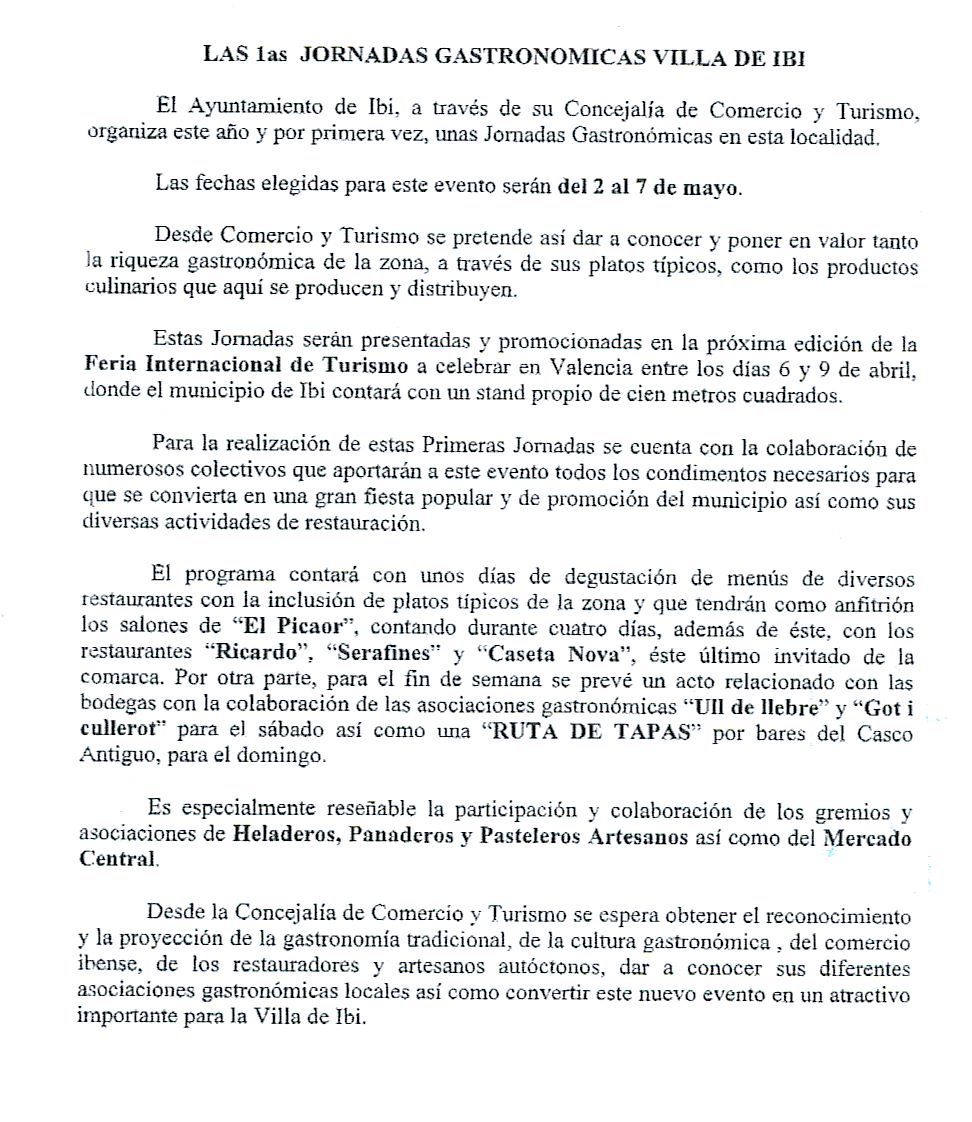 El Ayuntamiento de Ibi, a través de su Concejalía de Comercio y Turismo, organiza este año y por primera vez, unas Jornadas Gastronómicas en esta localidad.