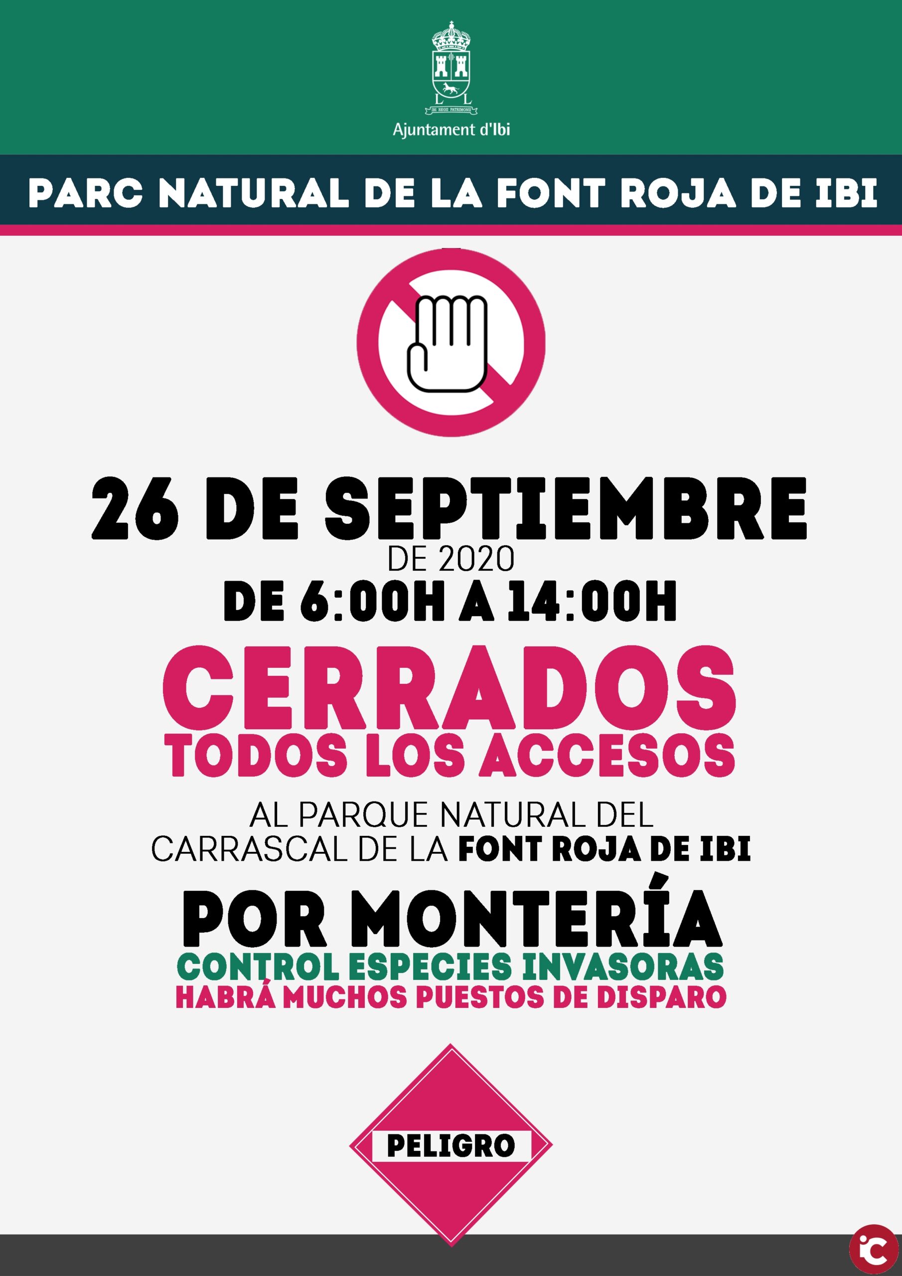 El sábado 26 de septiembre de 2020 los accesos al Parque Natural del Carrascal de la Font Roja de Ibi permanecerán cerrados para llevar a cabo una montería de caza, organizada por el Coto de Peydró A10123. La batida se realizará debido a los problemas y daños que ocasionan el gran número de arruís (especie invasora) y jabalíes que proliferan sin control en el espacio natural.