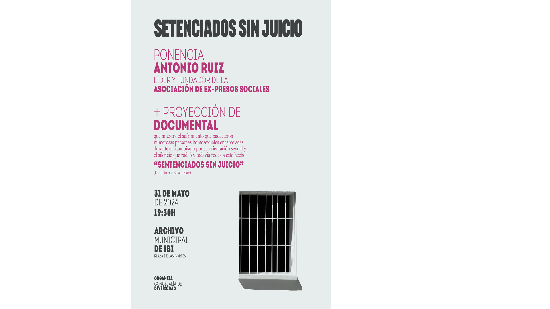La regidoria de Diversitat de l’Ayuntamento d’Ibi ha programat una activitat centrada en la història i en el col·lectiu LGTBI a través d’una ponència, per part d’Antonio Ruiz, líder i fundador de l’Associació ex-presos socials, i després de la qual tindrà lloc la projecció del documental “Sentenciats sense judici”, que mostra el sofriment que van patir nombroses persones homosexuals empresonades durant el franquisme per la seua condició sexual i el silenci que va envoltar i encara envolta a aquest fet. El documental podrà visionar-se a Ibi gràcies a la cessió des de l’arxiu de la Generalitat, a través de “L’armari de la memòria”.