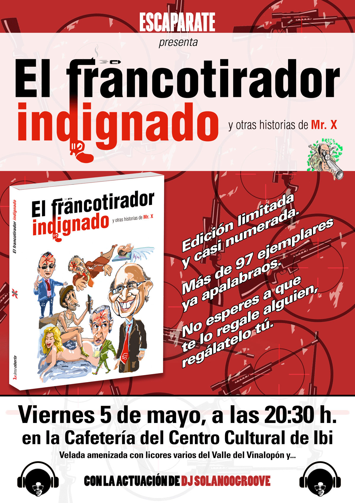 El autor de bestsellers a nivel comarcal Míster Equis presenta su cuarto libro, ‘El francotirador indignado (y otras historias)’, ilustrado con dibujicos de Vicente Blanes. La presentación correrá a cargo del no menos afamado librero ibense Luis Casado. Además, el autor firmará ejemplares de su libro y habrá un surtido limitado de viandas, olivas, papas y cascahueses, debidamente regados con grandes y pequeños caldos del valle del Vinalopón. La animación será cosa de DJ SolanooGroove, desde el corazón de la Foia. ¿Qué podría salir mal? Este evento está abocado al éxito más estrepitoso.