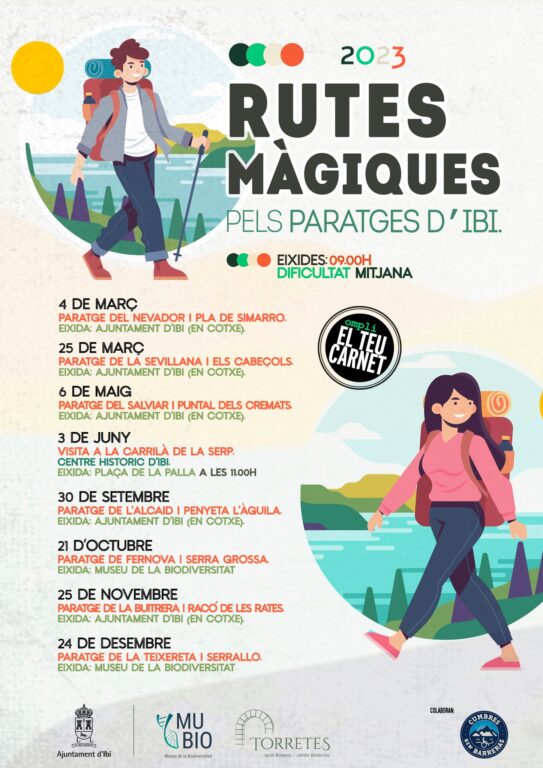 El Museo de la Biodiversidad de Ibi, junto a la Estación Biológica de Torretes, presenta la programación de “Rutes màgiques pels paratges d’Ibi 2023”. Un paseo por los alrededores de nuestra población que podrán disfrutar mayores y pequeños durante todo el año, con un nivel de dificultad media. Todo el que quiera podrá disponer del carnet para ir cuñándolo en cada ruta y cumplir el reto de hacerlas todas o las máximas posibles.