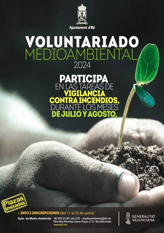 La concejalía de Medioambiente del Ayuntamiento de Ibi informa que en este año 2024 vuelve a abrirse el plazo de inscripción para formar parte de un equipo de Voluntarios Medioambientales para los meses de julio y agosto.