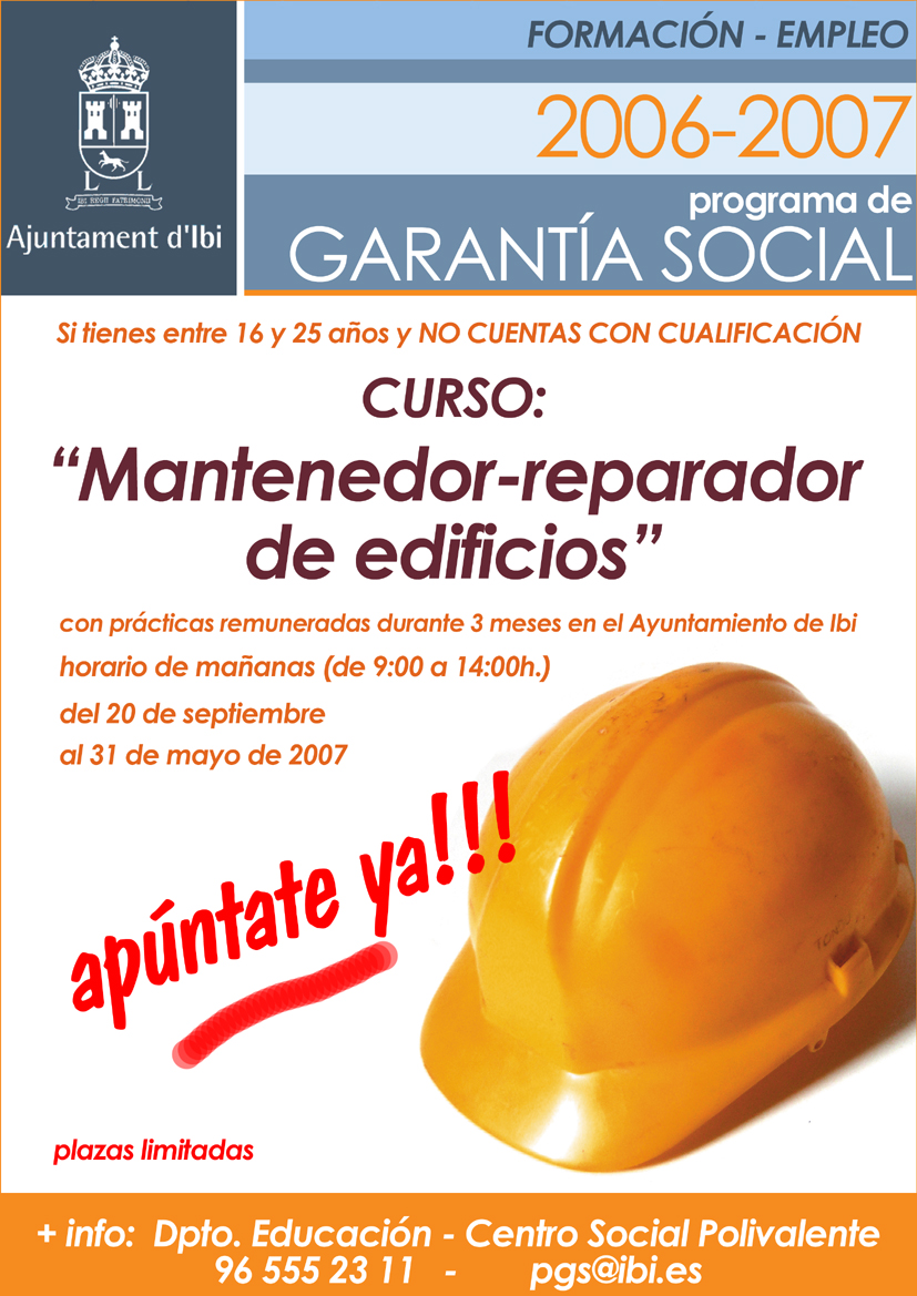 El Ayuntamiento de Ibi está organizando el VI Programa de Garantía Social de Mantenedor-Reparador de edificios, dirigido a jóvenes de 16 a 25 años que no hayan alcanzado los objetivos de la E.S.O. ni posean titulación alguna de Formación Profesional.