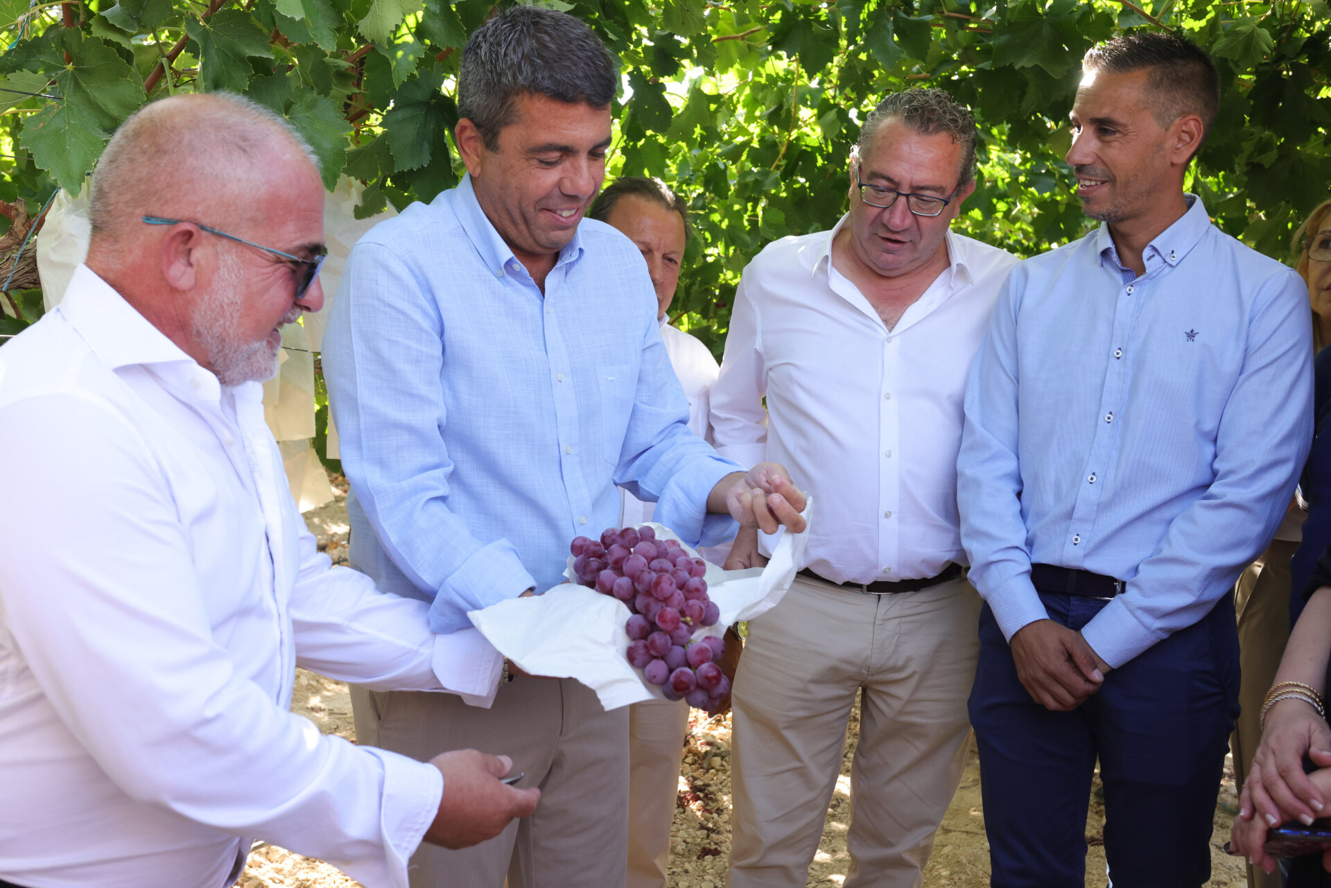 El president de la Generalitat, Carlos Mazón, i el president de la Diputació d’Alacant, Toni Pérez, han coincidit hui en defensar amb fermesa el transvasament Xúquer-Vinalopó i en reconéixer la importància del sector agrícola valencià durant l’acte de tall simbòlic del primer raïm embolsat de la temporada, celebrat a La Romana.