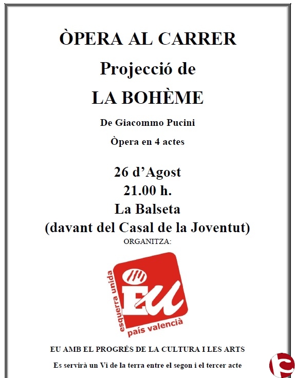 El 26 d´Agost a les 21.00 h. a la Balseta(davant del Casal de la Joventut), EU AMB EL PROGRÉS DE LA CULTURA I LES ARTS, organitazará l´òpera.