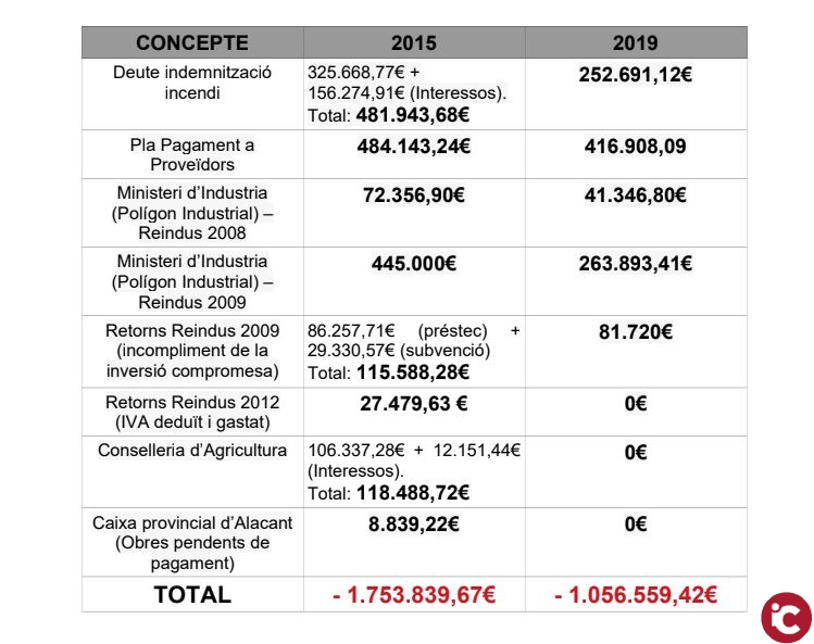 Al llarg daquest període s’han desenvolupat una sèrie de mesures financeres i econòmiques per tal de veure reduït fins aquest punt el nivell d’endeutament, entre les quals destaquen l’elaboració d’un Pla d’Ajust Econòmic i un pla de pagament; la consignació d’un crèdit amb el Ministeri d’Economia per tal de pagar una sentència que estava pendent de pagament per un incendi ocorregut l’any 1992; el canvi de modalitat del Pla de Pagament a Proveïdors passant de pagar el 6% d’interessos en la modalitat anterior, consistent en la retenció de les participacions en tributs de l’Estat, a un 1% actual amb la modalitat de crèdit bancari; a més de la reducció de totes les despeses innecessàries i la optimització dels recursos per tal de dur a terme pagaments i retornaments que han sigut requerits pel Ministeri d’Indústria per diversos Plans de Reindustrialització del 2008, 2009 i 2012 que no havien sigut ben justificats o en els quals no es va fer la inversió compromesa. Així doncs, el deute municipal actual ronda la xifra de 1.056.559,42, mentre que a finals del 2015 era de 1.753.839,67.