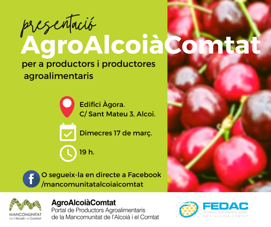 La Mancomunitat de lAlcoià i el Comtat i la Federació dempreses de lAlcoià-El Comtat (FEDAC) presenta AgroAlcoiàComtat, una plataforma per a fomentar el comerç de proximitat i el sector agroalimentari. Lacte tindrà lloc el pròxim 17 de març a les 19 h en lÀgora. Es tracta duna plataforma de promoció impulsada per la Mancomunitat i FEDAC mitjançant la qual productors i productores agroalimentaris podran promocionar els seus productes per a la venda directa a persones consumidores. A més, es podrà seguir en directe a la pàgina de Facebook de la Mancomunitat de lAlcoià i el Comtat.