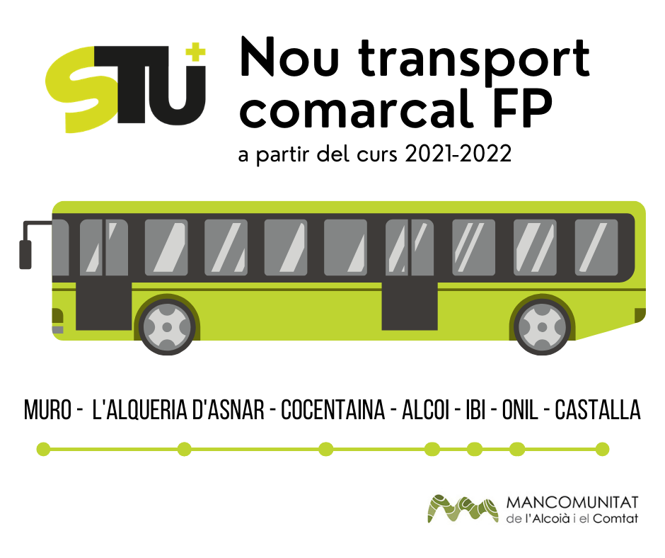 La Mancomunitat de l’Alcoià i el Comtat oferirà a partir del pròxim mes de setembre un servei d’autobús que unirà els principals municipis amb centres de Formació Professional de l’Alcoià, el Comtat i la Foia de Castalla. Hi haurà un total de quatre autobusos diaris al llarg del curs, dos d’anada i dos de tornada, pensats per a cobrir els torns de matí i vesprada dels centres d’estudis, que faran el recorregut des de Muro fins a Castalla, amb parades a l’Alqueria d’Asnar, Cocentaina, Alcoi, Ibi i Onil.