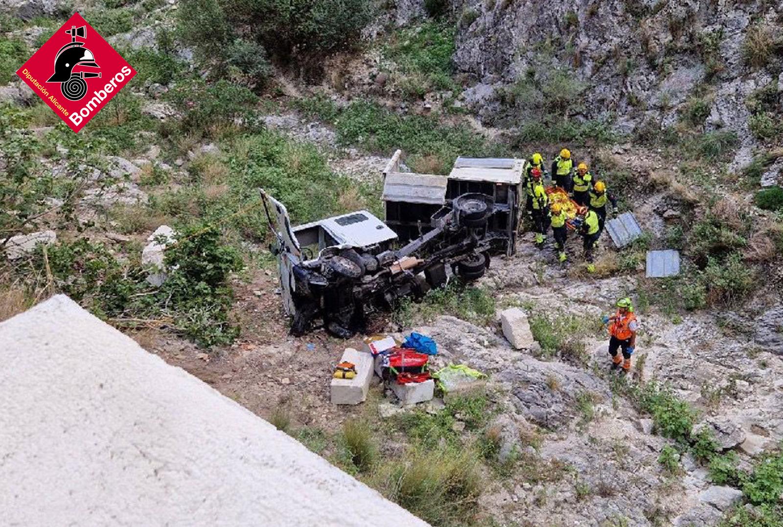 Els Bombers de la Diputació d’Alacant van haver d’acudir a un rescat, en la CV-170 a l’altura de Millena, per a auxiliar a dos ocupants d’un camió que es va precipitar barranc a baix uns 15 metres, havent de realitzar les pertinents maniobres per a poder alliberar-los i deixar-los a la disposició dels servicis sanitaris.