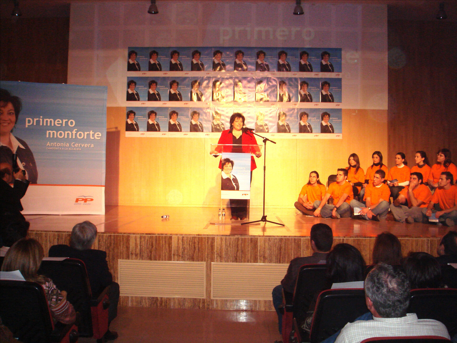 La gestión impecable y el cambio radical que ha vivido el municipio en los últimos cuatro años han provocado que la dirección del Partido Popular haya revalidado su confianza en Antonia Cervera como candidata a la Alcaldía de Monforte del Cid. La política es igual a proyectos terminados, dijo tajante. De nada sirve que las iniciativas en papel estén guardadas en el cajón de la mesa de un alcalde. De nada sirve que un alcalde esté en su despacho. Nuestro programa de 2003 está en las calles, en las plazas, en los centros sanitarios y educativos, en las nuevas infraestructuras, en los caminos y en las instalaciones deportivas, que es donde tienen que estar las promesas de un político que cumple con su ciudadanía.