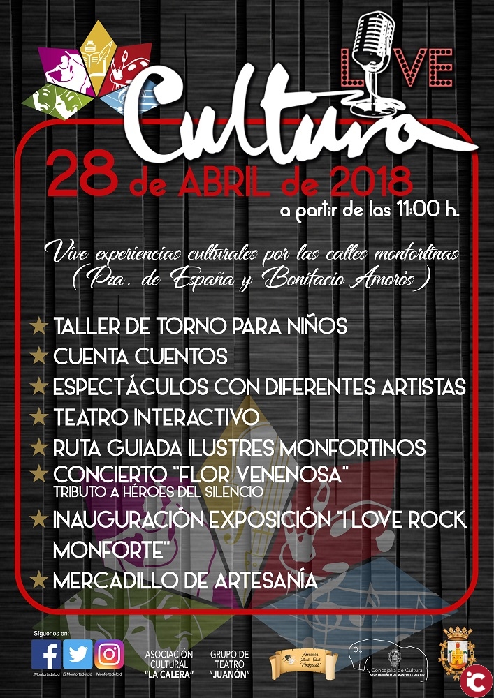 24 de abril de 2018, Monforte del Cid. La Concejalía de Cultura de Monforte del Cid vuelve a celebrar la Semana Cultural en el municipio del valle de las uvas con un nuevo aliciente Cultura Live. La iniciativa del Ayuntamiento de Monforte del Cid consiste ofrecer espectáculos en directo en el centro histórico y en generar una experiencia más dinámica del concepto cultura.