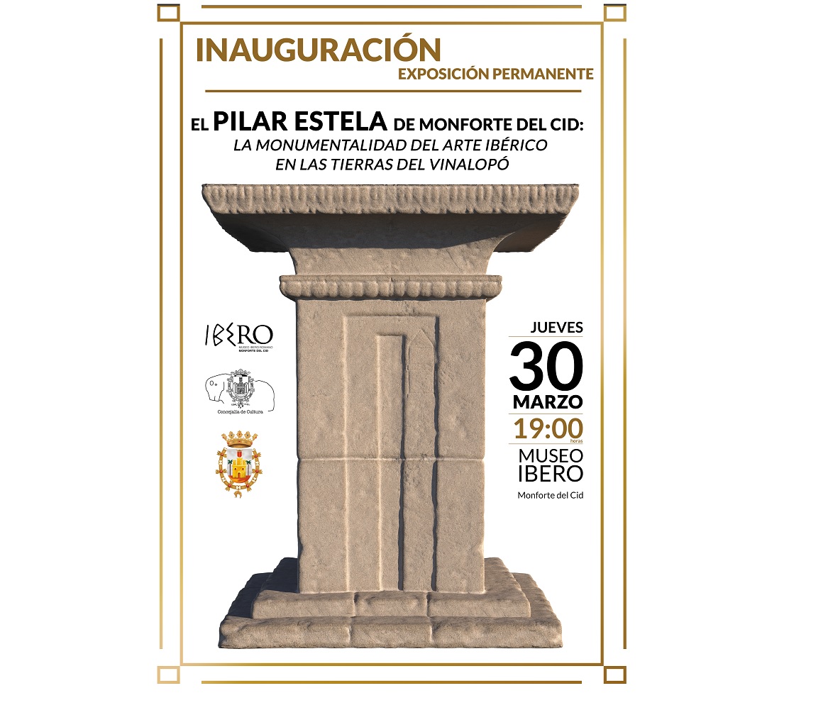 La concejalía de Cultura presentará “El pilar estela de Monforte del Cid. La monumentalidad del arte ibérico”. Esta nueva exposición estará dedicada al monumento íbero y pasará a formar parte de las salas permanentes del museo.  Su inauguración está prevista para el jueves, 30 de marzo, a las 19:00 horas.