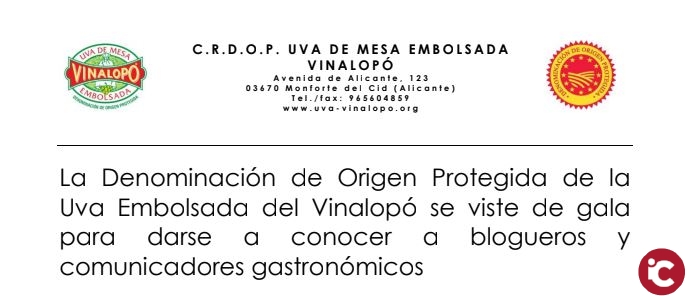 Periodistas y expertos en comunicación digital conocerán las cualidades gastronómicas y nutricionales de la Uva Embolsada del Vinalopó en el III Blogtrip alrededor de esta fruta, que tendrá lugar el próximo sábado 03 de noviembre y está organizado por el Consejo Regulador de la DOP- Uva de Mesa Embolsada Vinalopó, en colaboración con la Conselleria de Agricultura, Medio Ambiente, Cambio Climático y Desarrollo Rural.