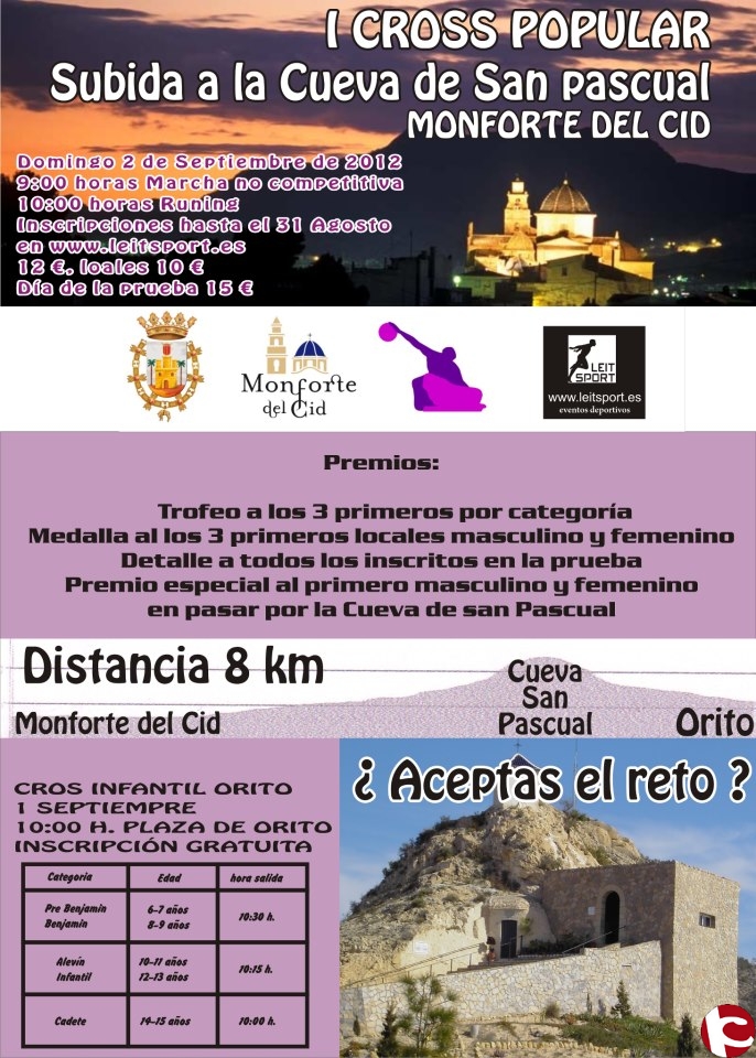 La prueba que partirá desde Monforte del Cid atravesará Orito y finalizará con la subida a la Cueva de San Pascual, con una distancia total de 8 Km. Se podrá participar de dos formas diferentes, por un lado a las 9 horas se iniciará la subida a pie, que será una marcha no competitiva y por otra parte a las 10 horas comenzará la prueba de runing. El precio para todos aquellos que deseen participar será de 12 euros, los corredores locales pagarán 10 euros y el día de la prueba el precio será de 15 euros.